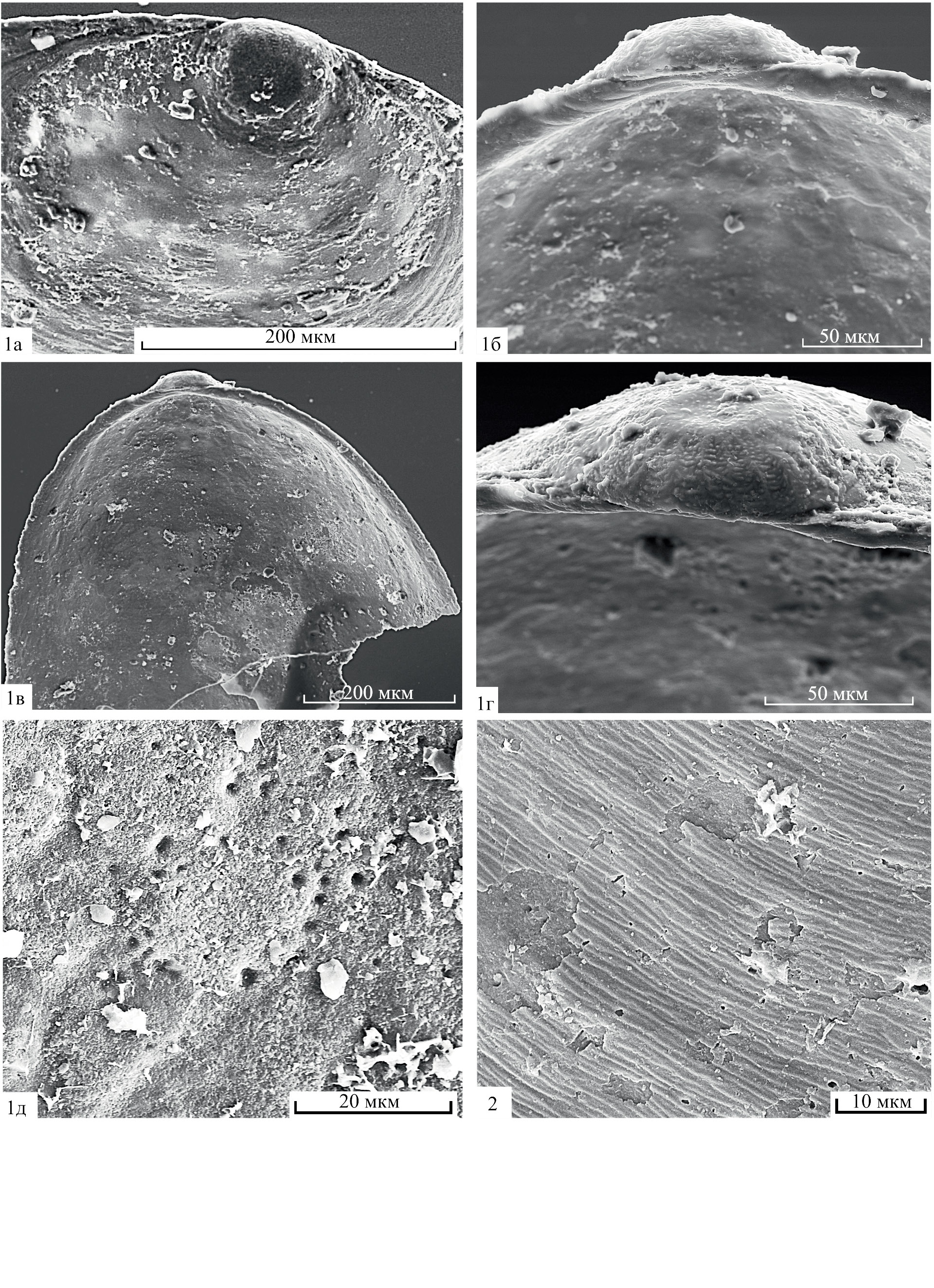 Фиг. 1, 2. Lingulipora? sp.: 1 – экз. 712/7: 1а – задняя часть спинной створки снаружи, виден протегулум, его граница с брефической раковиной, брефическая раковина и частично ее граница с взрослой створкой; 1б – задняя часть той же створки изнутри, очень узкая в примакушечной части псевдоинтерарея, расширяющаяся к боковым сторонам и несущая несколько складок; 1в – та же створка, с другим увеличением; 1г – протегулум в примакушечной части спинной створки, видна вдавленность в центральной части и отдельные струйки на боковых сторонах; 1д – выходы каналов-пор на внутренней поверхности спинной створки; 2 – экз. 712/8, тонкая концентрическая струйчатость на поверхности спинной створки.