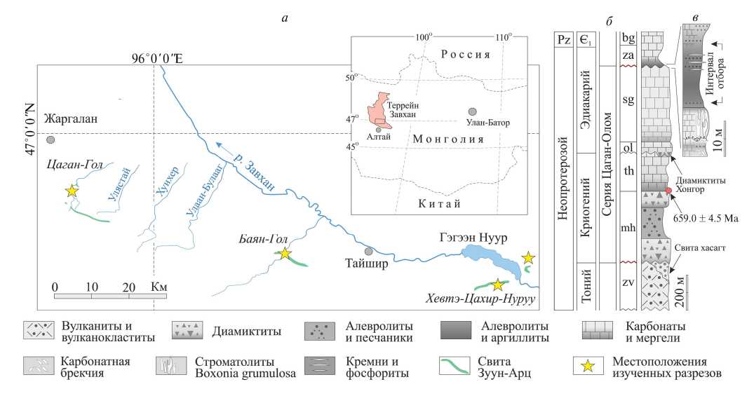 Последовательность неметаморфизованных докембрийских отложений террейна Завхан, детально изученная с начала 1960-х гг. (Khomentovsky, Gibsher, 1996), в настоящее время стратиграфически существенно переосмыслена и наполнена новыми геологическими и геохимическими данными (Macdonald et al., 2009; Овчинникова и др., 2012; Bold et al., 2013, 2016a, 2016b, 2020; Кузнецов и др., 2014; Rooney et al., 2015; Smith et al., 2015). Эта последовательность с глубоким размывом залегает на вулканитах свиты завхан (802.1 ± 1.0 и 797.2 ± 1.1 млн лет), а также на вышележащих песчаниках свиты хасагт и включает в себя мощную литологически разнородную серию цаган-олом, а также вышележащую глинисто-карбонатную свиту Зуун-Арц (Bold et al., 2016b), охватывая стратиграфический интервал от криогения до терминальных горизонтов эдиакария (рис. 1, б). Однако внутри этой последовательности присутствуют стратиграфические перерывы, продолжительность которых остается неопределенной. В настоящее время принимается, что несогласие, а также горизонт диамиктитов Хонгор, коррелируемых с олединением Марино (Macdonald et al., 2009), делит серию цаган-олом на две части: нижнюю (поздний криогений) и верхнюю (ранний эдиакарий). В кровле серия ограничена крупным региональным несогласием и перекрыта глинисто-карбонатными отложениями свиты Зуун-Арц (рис. 1, б). Эти отложения представляют собой терминальный горизонт эдиакария и в самой верхней части содержат кембрийскую δ13С экскурсию “BACE” (541 млн лет) (Smith et al., 2015; Topper et al., 2022). Поскольку в известняках верхней части серии цаган-олом (свита шургат) отсутствуют следы глобальной отрицательной δ13С аномалии Шурам, минимальный возраст серии ограничен 580 млн лет (Bold et al., 2016b). Таким образом, длительность перерыва в основании свиты Зуун-Арц по современным данным составляет более 30 млн лет.