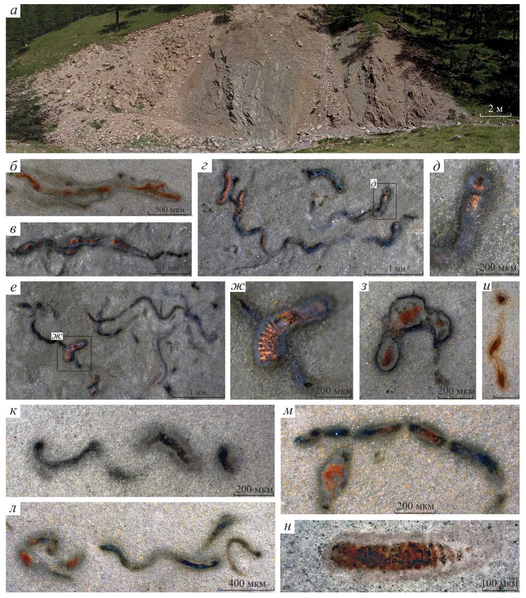 Помимо минерализованных форм сохранности, в районе Хевте-Цахир-Нуруу на поверхностях аргиллитовых слоев обнаружены крупные обособленные углеродистые компрессии сильно разложенных нитчатых фоссилий (рис. 2, л–н). Форма большинства остатков подчеркнута окислами железа, вероятно, образовавшимися при окислении пирита, рассеянного внутри компрессий. Ширина лент колеблется от 50 до 300 мкм, а видимая длина достигает 1 см. Четкие контуры и выдержанная ширина компрессий указывают на то, что они скорее являются остатками индивидуальных организмов или колоний, чем обрывками цианобактериальных матов.