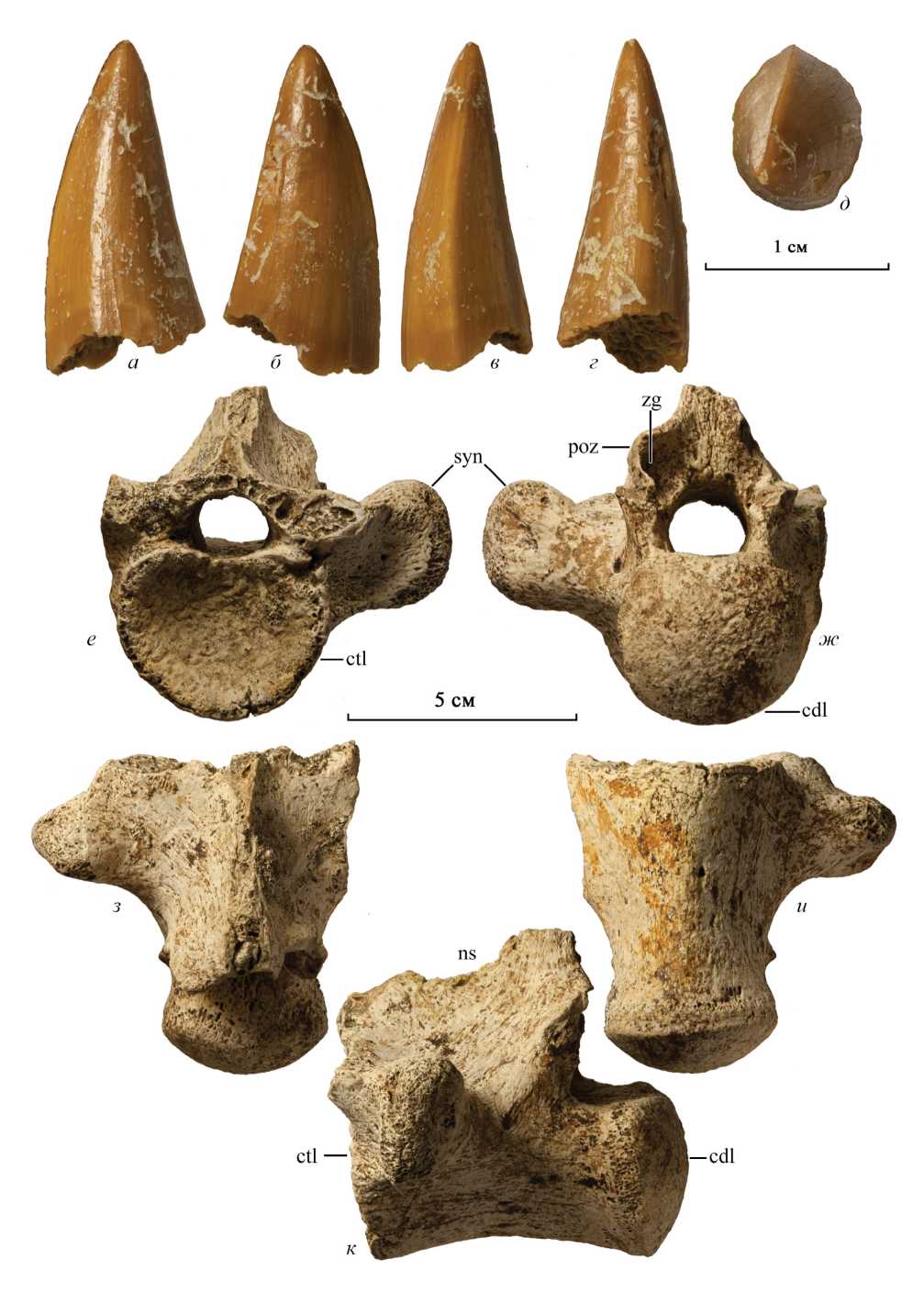 Рис. 3. Clidastes sp.: а–д – зубная коронка, экз. ОШММ № 118: а – лингвальный вид, б – буккальный вид, в – вид спереди, г – вид сзади, д – вид с апикальной стороны; е–к – грудной позвонок, экз. ОШММ № 133: е – вид спереди, ж – вид сзади, з – дорсальный вид, и – вентральный вид, к – латеральный вид; Россия, Оренбургская обл., Ижбердинский карьер; верхний мел, нижний кампан. Обозначения: cdl – задняя сочленовная поверхность позвонка; ctl – передняя сочленовная поверхность позвонка; ns – остистый отросток; poz – задний сочленовный отросток позвонка, постзигапофиз; syn – боковой отросток позвонка; zg – зигантр.