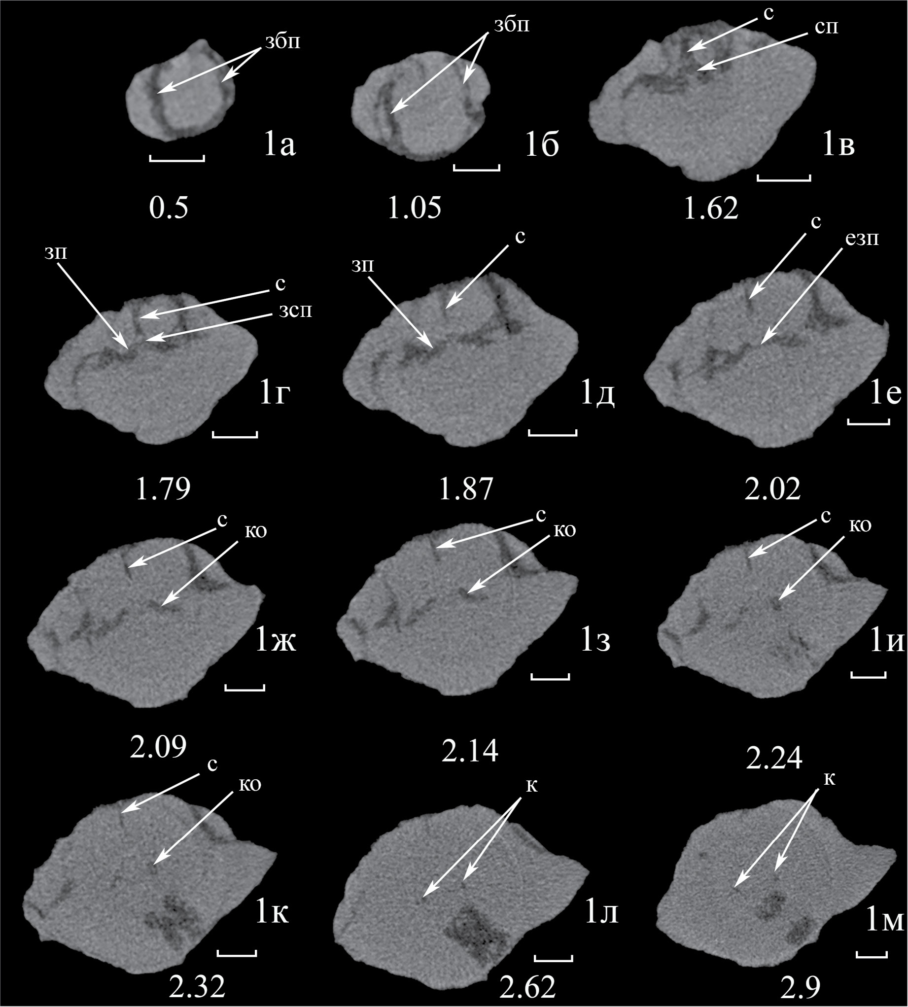 Рис. 1. Виртуальные поперечные срезы раковин Orbiculatisinurostrum kiselicum (Nalivkin, 1979): а–з – паратип ЦНИГР музей, № 3085/540; и–п – паратип ЦНИГР музей, № 3085/538; Урал, берег р. Ряузяк; верхний девон, верхний фамен, лытвенский горизонт. Обозначения: збп – зубные пластины, зп – замочная пластина, к – круры, ко – круральные основания, с – септа, сп – септалий. Масштаб – 1 мм. Рядом с каждым срезом стоит число, соответствующее его расстоянию от макушки брюшной створки. Круговые элементы на срезах – артефакты вращения; не являются морфологическими структурами раковин.