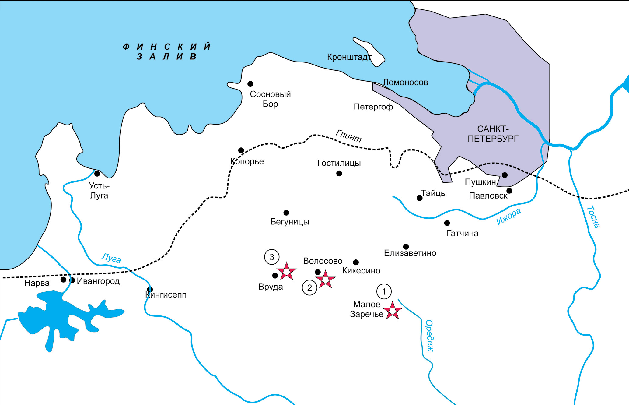 Рис. 1. Карта Ленинградской обл. с указанием изученных местонахождений (отмечены красной звездочкой). Обозначения: 1 – Малое Заречье, 2 – Волосово, 3 – Вруда.
