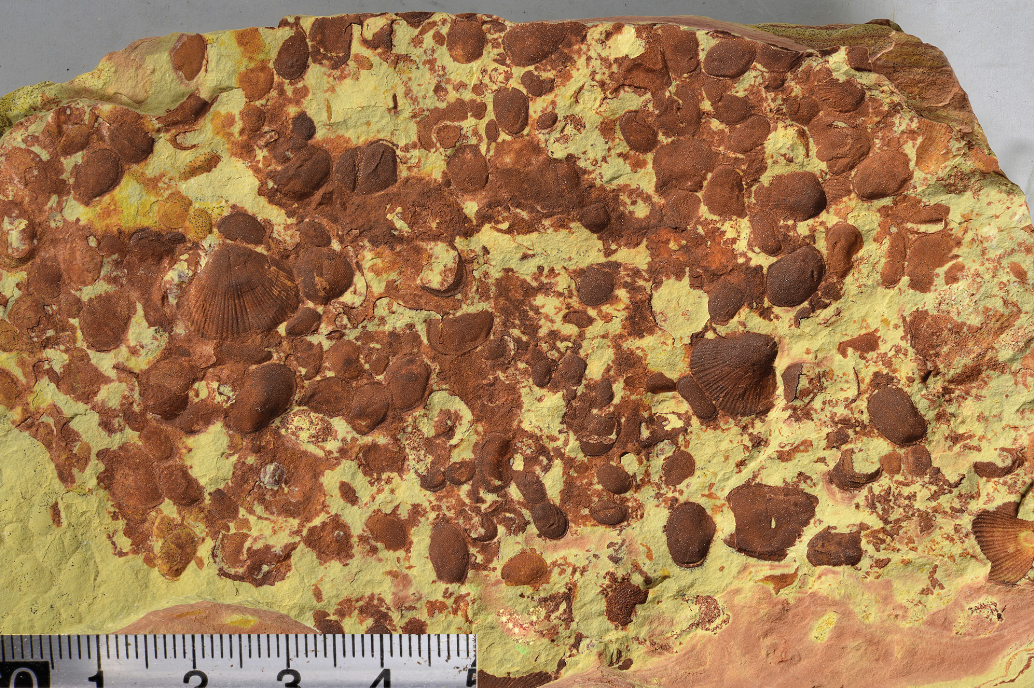Рис. 2. Многочисленные ожелезненные створки Isochilina punctata (Eichwald) вместе с редкими створками замковых брахиопод, образующие “ракушечную мостовую” (обр. № 5919/6).