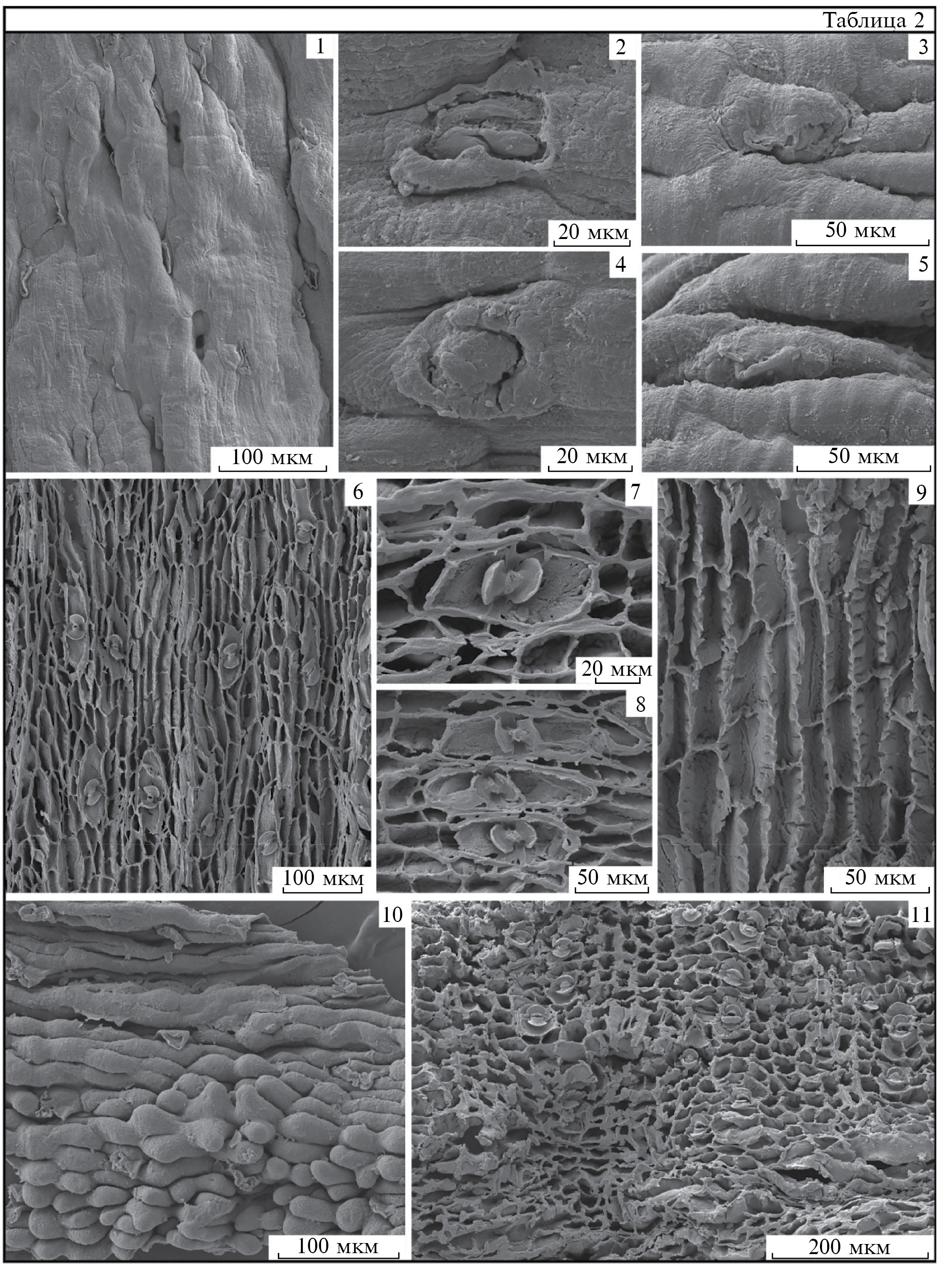 Эпидермальное строение листьев было изучено по стандартной методике, путем последовательного помещения в соляную, плавиковую и азотную кислоты с последующей обработкой едким кали. Полученные кутикулы монтировались на столик, покрывались золотом и изучались в СЭМ Tescan в режиме высокого вакуума (SE детектор, 30 kV).