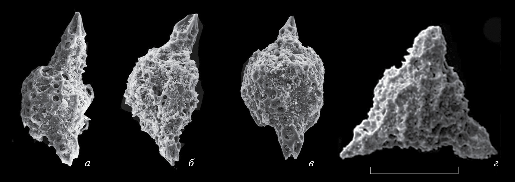Рис. 1. Типовой вид Trigonarcticоsphaera russica (Vishnevskaya, 2023) (а–в – Западная Сибирь, Усть-Манья, скв. 22, гл. 110–114 м, кампан; г – Тамбовская обл., Иноковка, скв. 19A, гл. 8.8 м, сантон–нижний кампан): а – голотип ГИН, № K22-57-32, б – экз. ГИН, № K22-57-31, в – экз. ГИН, № K22-57-38, г – паратип ГИН, № 19A-8.8/5-5. Длина масштабной линейки 100 мкм.