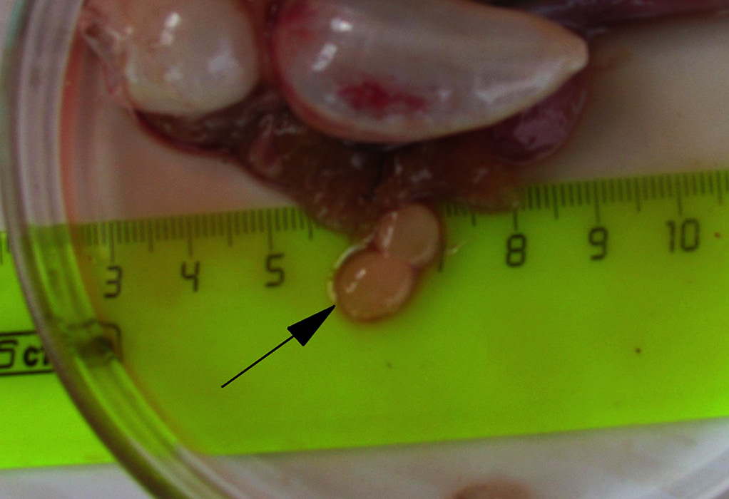Figure 1. Plasmodia of Myxobolus pronini (arrow) in the abdominal cavity of the gibel carp