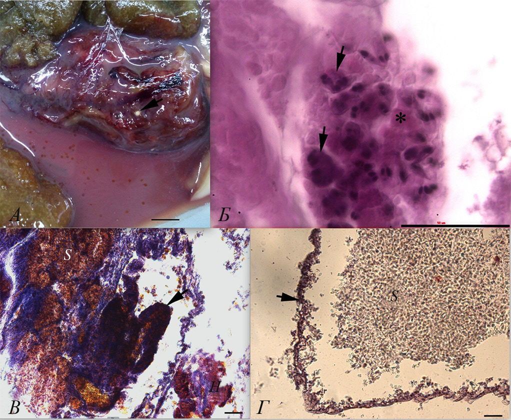 Figure 2. A – solitary cyst (arrow) in the hepatopancreus of the gibel carp. Scale 1 cm. Б – histological section of the pancreas exocrine tissue (arrow) of the gibel carp with developing spores of Myxobolus pronini (arrows). H&E. Г – pancreas (Н), connected with blood vessels. Mallory staining. (в); Spores (S) of Myxobolus pronini in the abdominal cavity surrounded by a layer of collagen fibers (arrow). Mallory staining. Scale (Б–Г) 50 µm