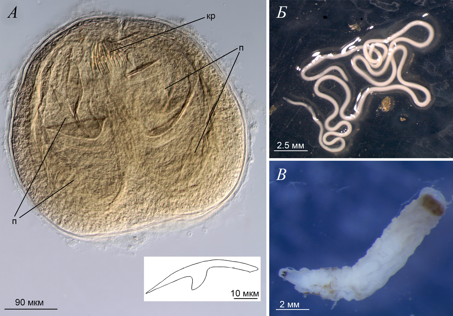 Figure 3. Metacestode Monocercus sp. (A), nematode of the Mermithidae family (Б), larva of the fly Pherbellia sp. (В). кр – hooks, п – sucker.