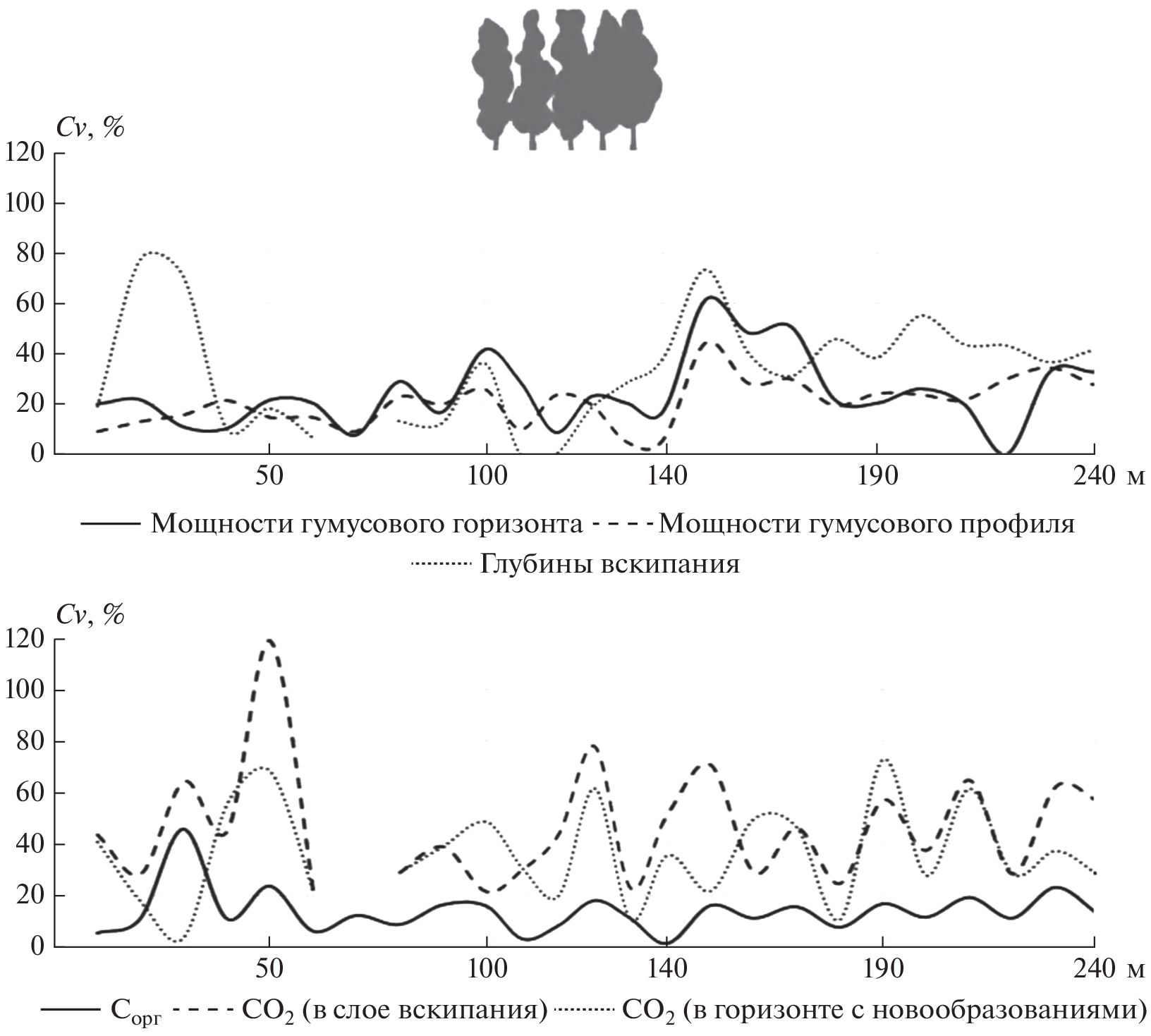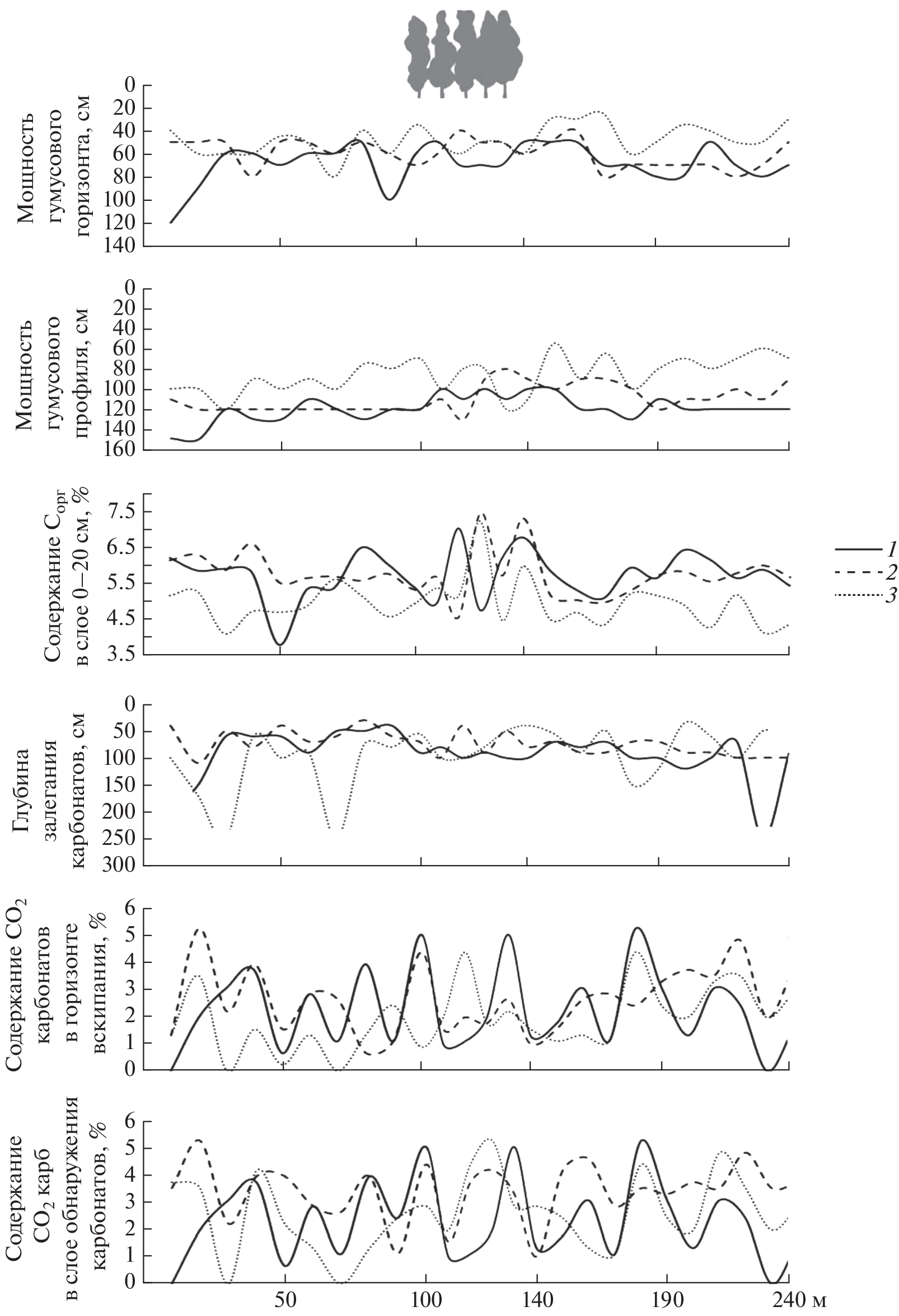 The short-range variation of soil properties is a particular expression of the spatial soil variability; it is non-directional short-periodic (in the range of a few meters) changes in soil-profile features. The short-range variation of soil properties is aimed to characterize the continuum nature of soil cover instead of the discrete (as in the soil cover pattern theory), thus the soil cover is presented by a continuum field of various soil properties, and the boundaries of the selected soil properties ranges may or may not coincide with the soil taxonomic boundaries. The study is based on soil data of three parallel transects (length 240 m) in the watershed, perpendicularly crossing the 60-year-old shelterbelt in their central part. The sampling step was 10 m on agricultural fields, 6 – under the shelterbelt; In total, the features of the humus (the content of organic carbon in the 0–20 cm layer, the thickness of the humus horizon and profile) and carbonate (the effervescence depth, the carbonate content in the effervescence layer and the horizon of maximum accumulation of carbonates) profiles were studied at 75 points. It was revealed that the parameters of the humus and carbonate profiles of soils have periodic changes with a step of 6–10 meters. The parameters of the humus profile are characterized by lower coefficients of variation (less than 30%) than the parameters of the carbonate profile of soils (more than 50%). The growth of trees on agrochernozems (Haplic Chernozem (Aric)) for 60 years led to the formation of new taxonomic components (postagrogenic agrochernozems (Haplic Chernozem)), characterized by a smaller lateral variation in soil properties compared to arable soils. In total, 3 types of soils are found within the studied area: agrochernozem (64 points; Haplic Chernozem (Aric, Loamic, Pachic)), clay-illuvial agrochernozem (7 points; Luvic Chernozem (Aric, Loamic, Pachic) and Luvic Chernic Phaeozem (Aric, Loamic, Pachic, Loamic, Pachic)) and agrochernozems, clay-illuvial quasigley (4 points; Luvic Stagnic Chernic Phaeozem (Aric, Loamic, Pachic)), including 8 subtypes.