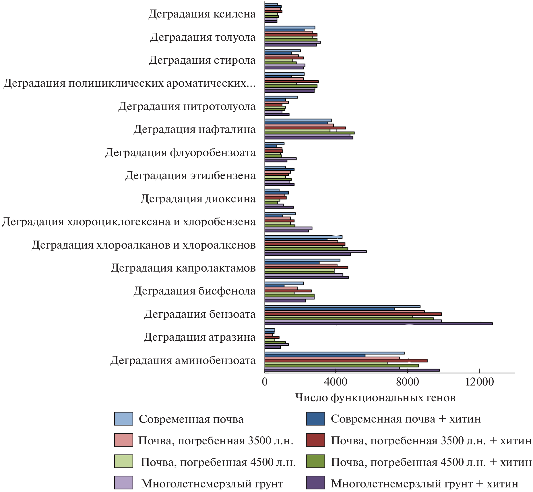 The phylogenetic and functional diversity of a prokaryotic complex with biotechnological potential (carrying out the destruction of biopolymers, hydrocarbons; capable of synthesizing secondary metabolites; nitrogen fixation process) in soil and associated ecosystems has been studied. In order to identify the specifics of the development of metabolically active prokaryotes with biotechnological potential, the patterns of their distribution and the dependence of functional activity on the main environmental factors have been established. The study used molecular biological and bioinformatic approaches. The range of samples studied included modern soils (Volgograd, Tula, Moscow regions, Siberia and the Northern part of Central Kamchatka), relict habitats (Volgograd Region and Central Kamchatka) and permafrost soils of Antarctica (King George Island). The impact of anthropogenic and abiogenic loads on the development of the prokaryotic community was considered. In soils exposed to anthropogenic or abiogenic loads, along with a decrease in the diversity and abundance of prokaryotes, an increase in the number of genes marking the ability of a community to biodegradate xenobiotics, as well as genes encoding nitrogen transformations and the level of metabolism of cofactors and vitamins was found. The bacterial complex is capable of nitrification with high oil contamination of the soil, and its role also increases in the lower layers of the soil profile. Archaea play a leading role in the nitrification process in undisturbed soils. The revealed patterns indicate a high metabolic potential of the prokaryotic component of the objects under consideration and open up opportunities for biotechnological use of strains isolated from relict habitats.