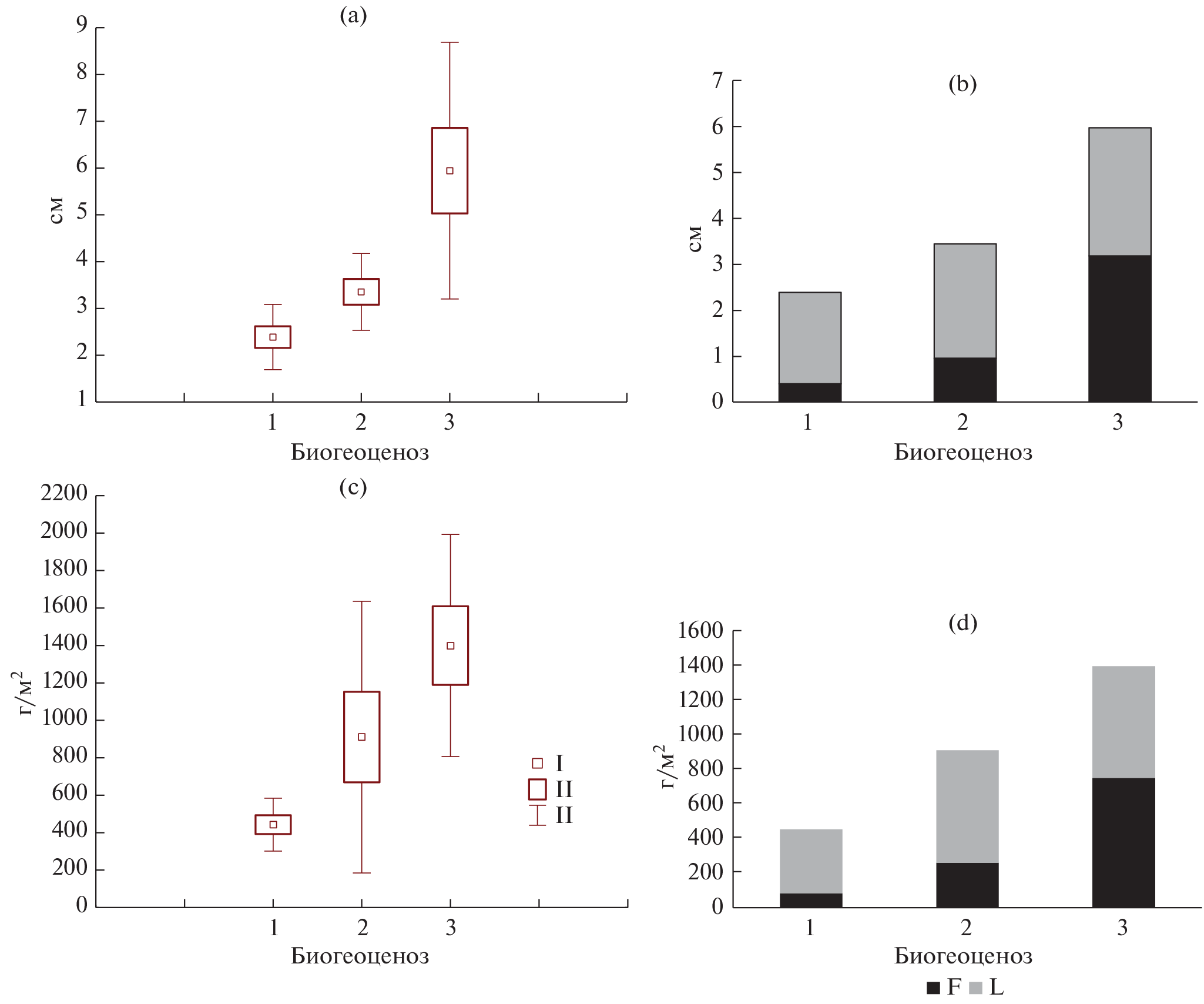 The ecological and coenotic structure of the living ground cover and the structural and functional features of forest litter for three types of forests were studied: hairy-sedge birch forest, birch-aspen hairy-sedge, soddy-pike birch forest, forming a sequential row as hydromorphism increases within the slope, gradually to the center of the drive-dividing depression. The ecological characteristic of the living ground cover is based on the grouping of ecological-coenotic formations according to A.A. Nitsenko and ecological scales L.G. Ramensky and H. Ellenberg. Increasing hydromorphism is accompanied by an increase in ecological and cenotic diversity. The total trophicity score also increases under conditions of increased hydromorphism – in the soddy pike birch forest – in combination with low Ellenberg acidity index. Conversely, the maximum scores for these indicators, with high variation, belong to the birch-aspen forest, which occupies intermediate positions in the series of increasing hydromorphism. It was established that the studied stands are characterized by destructive and fermentative litters. As hydromorphism increases, the litter deposit increases from 400 to 1400 g/m2 with a simultaneous increase of detritus part in L subhorizon. About 60% of total organic matter deposit concentrated the litter of small-leaved plantations is accounted by easily decomposing fractions. With a regular increasing ash content in the system of subhorizons L–F, the maximum ash content is obtained for detritus fraction of L subhorizon. With a regular increase in the ash content in the system of subhorizons L–F, the maximum ash content is characteristic of the detritus fraction of the subhorizon L. The parameters of the ecological characteristics underlying the method of principal components showed a good grouping of the studied phytocenoses according to the degree of moisture, especially when using the general properties of litter (stocks, thickness, detritus content). The expediency of using the properties of litter to establish the similarities and differences of the studied phytocenoses as characteristics that integrally reflect the characteristics of moisture is revealed. The parameters of the living ground cover in conjunction with a number of structural and functional features of forest litter are adequate indicators of the degree of hydromorphism.