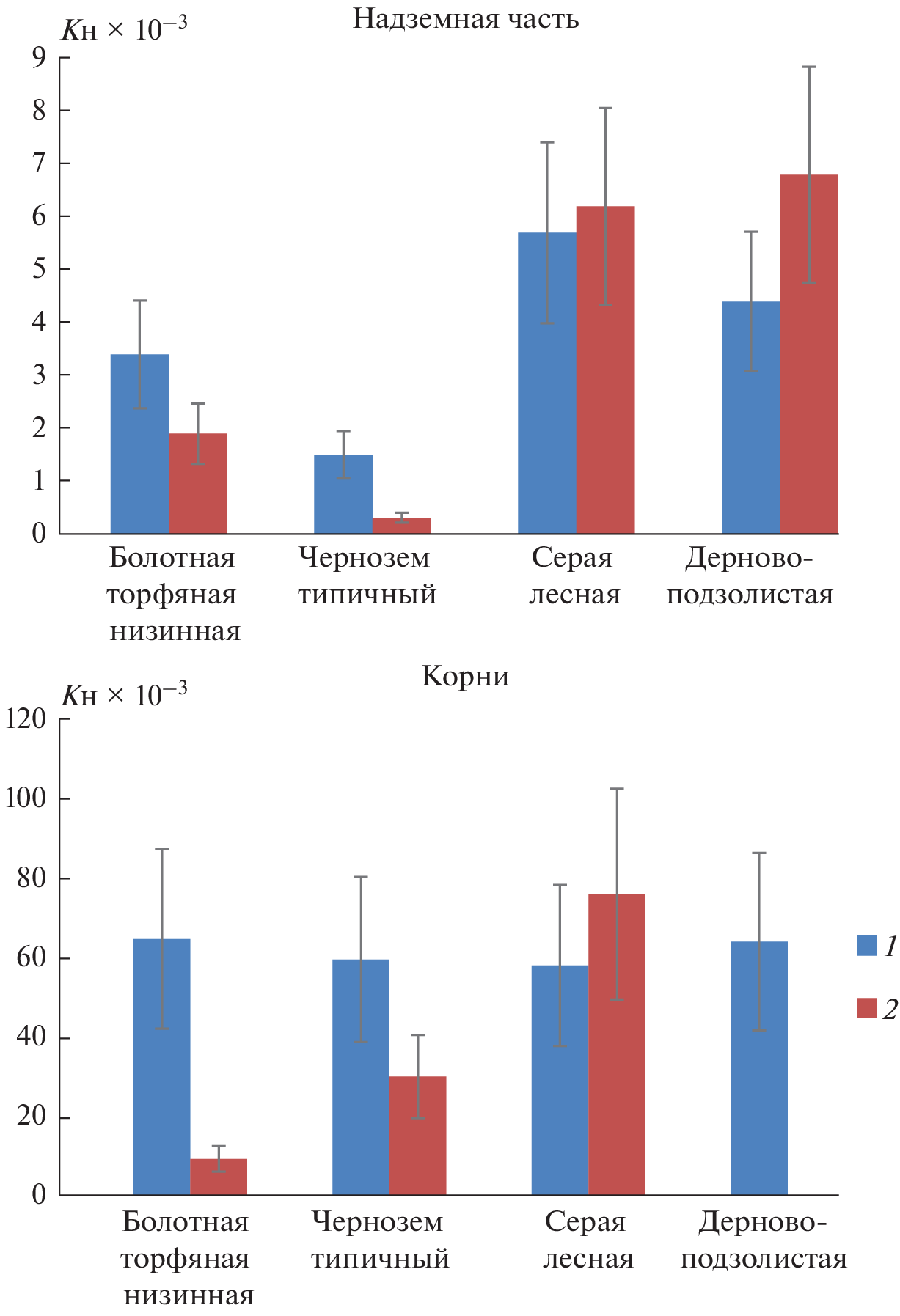 The high variability of the plutonium transfer factors presented in the literature makes it relevant to study the mechanisms that affect its migration ability and its availability for vegetation. The variability of transfer factors is explained by different properties of soils, since the redox potential and soil acidity can significantly affect the mobility of plutonium. In the vegetation experiment, the migration of plutonium in the “soil-agricultural plant” system was studied for different types of soils. The content of 239 + 240Pu was analyzed by alpha spectrometry with preliminary radiochemical isolation. Plutonium migration parameters were determined using barley (Hordeum) and beans (Fabaceae) as test cultures. The plutonium accumulation coefficients obtained in the course of vegetation experiments are in the range of 3.1 × 10–4–6.8 × 10–3, with an average value of 3.8 × 10–3 for the aboveground part of barley and 9.2 × 10–3–7.6 × 10–2, with an average value of 3.8 × 10–2 – for the root system of barley. The transfer factor range was 1.5 × 10–3–5.7 × 10–3 with an average value of 3.7 × 10–3 and 5.8 × 10–2–6.5 × 10–2 with an average value of 6.2 × 10–2 for the aboveground part and the root system of the beans, respectively. It has been determined that the nature of the plutonium distribution over the vegetative organs of the crops under consideration is non-uniform. On average, the plutonium transfer factor for the aboveground part of plants is lower than for the root part by more than 40 times. It has been determined that the accumulation of plutonium in the aboveground parts of plants growing on different types of soil is not the same for individual species/organs of agricultural plants. For the aboveground part of the agricultural crops under consideration, the transfer factors differ up to several orders of magnitude. In general, the accumulation of plutonium by vegetation growing on different soils types is arranged in the following row: soddy-podzolic (Retisol) and gray forest soil (Phaeozem) > lowland peat-bog (Histosol) \( \gg \) typical chernozem (Chernozem). The smallest accumulation of plutonium by vegetation is observed in soils with a high content of organic matter. For the root system of plants, the dependence of the plutonium accumulation coefficients on the soil type is uncertain.