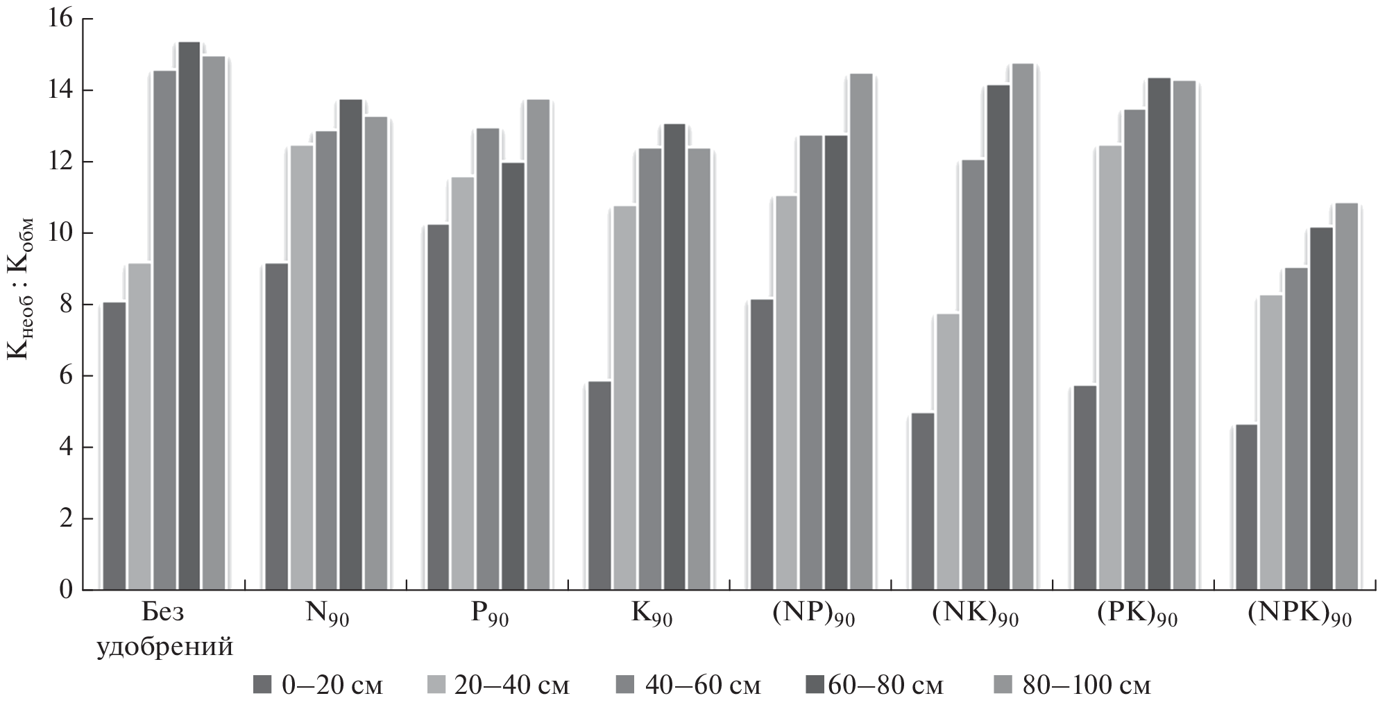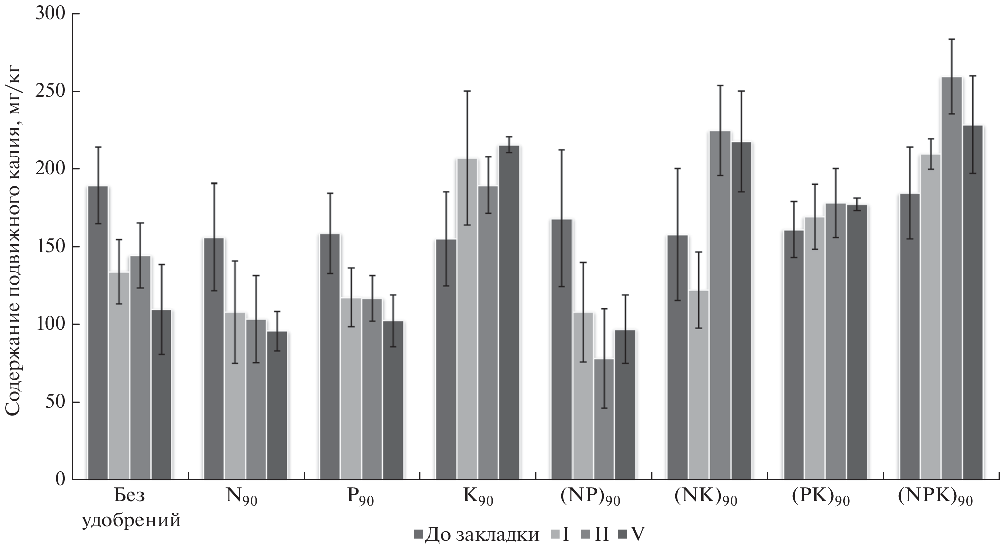 The effect of long-term use of nitrogen, phosphorus and potash fertilizers and their combinations (N, P, K, NP, NK, PK and NPK) on chang in sod-podzolic heavy loamy soil (Albic Retisol (Abruptic, Aric Loamic)) was studied the content of gross potassium and its easily exchangeable, exchangeable and non-exchangeable compounds. The research was carried out in a meter layer of soil under the conditions of a long-term stationary experiment laid down in the Perm Region in 1978. In the experiment, ammonium nitrate or urea, double or simple superphosphate and potassium chloride were used. The dose of fertilizers was 90 kg/ha in the primary plant food. Long-term application of potassium chloride in pure form and in combination with superphosphate and nitrogen fertilizers (K90, (PK)90, (NK)90, (NPK)90) provided an increase in the gross content of potassium in the arable soil layer by 1.1–1.2 times and its various compounds by 1.1–2.8 times (relative to the control variant). A narrowing of the ratio of non-exchangeable forms of potassium to exchange forms is noted here. Changes in the meter layer of soil depended on the combination of fertilizers, the studied form of potassium compounds in the soil. The introduction of only nitrogen and phosphorus fertilizers (N90, P90, (NP)90) without compensation for potassium removal during five rotations of the eight-field field crop rotation led to a decrease in the reserves of exchangeable and non-exchangeable potassium compounds in the 0–40 cm layer by 15–20%. The minimum level of potassium exchange compounds in sod-podzolic heavy loamy soil in a layer of 0–20 cm was 108–112 mg/kg.