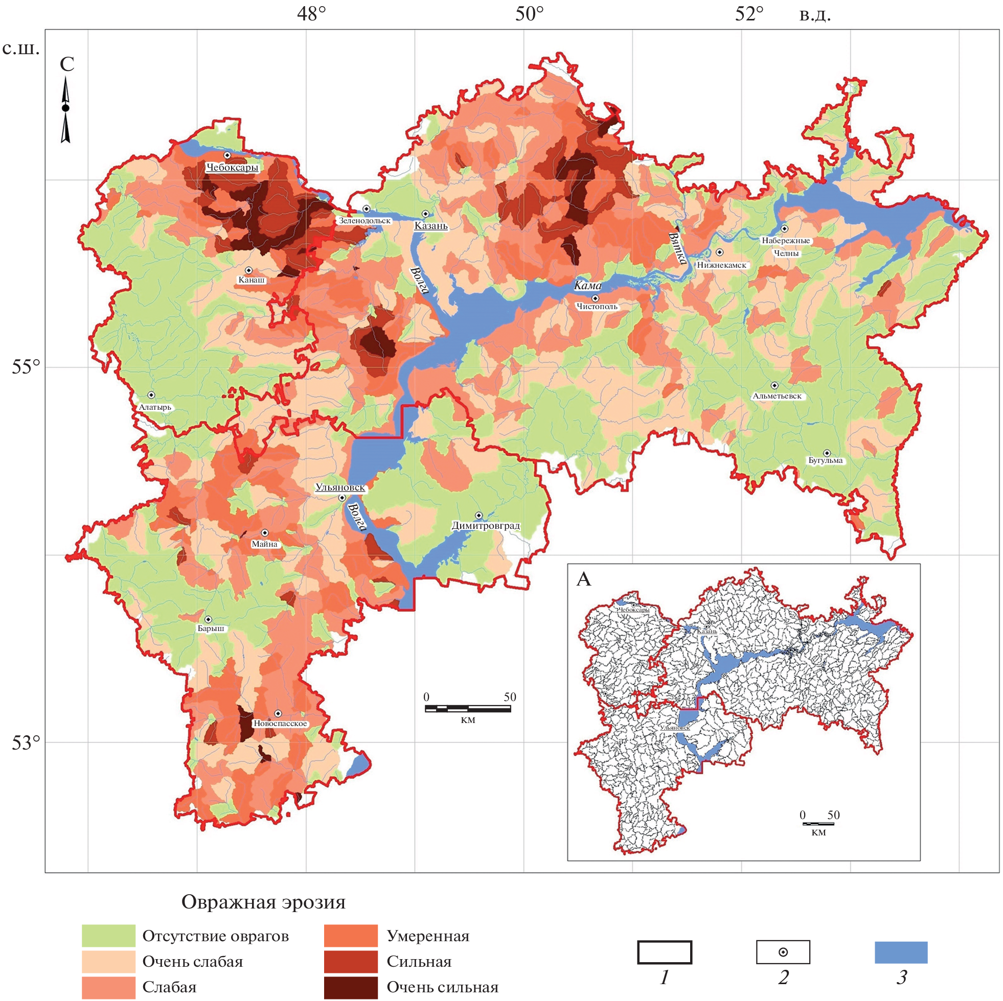 The article presents a new scheme of zoning of modern gully erosion in a large region of the Russian Federation. Automated landscape zoning by means of artificial neural networks was carried out in order to determine the natural and anthropogenic conditions for the development of the gully network. Erosion zoning was implemented on the basis of large-scale geoinformation mapping of gullies by the method of visual interpretation of high- and ultra-high-resolution satellite images for 2017–2021. The basins of small rivers (1314 in total) with an average area of 91 km2 are taken as operational-territorial units. 22688 gullies (including their holes) were identified in the study area, the average length of which is 65 m, and the total length of the gully network is about 1500 km. The density of the gully network averages 12 m/km2, reaching a maximum of 301 m/km2. The density of gully dissection is used as an indicator for the zoning of gully erosion, this indicator indirectly reflects the intensity of gully formation in geo-space. The dominant (84% of basins) are areas either with no gully dissection or having weak or very weak gully erosion. The main reasons for the widespread damping of gully erosion are related to changes in land use and in the climate system, as well as an evolutionary factor – the transition of many gully forms to the balka stage of development.