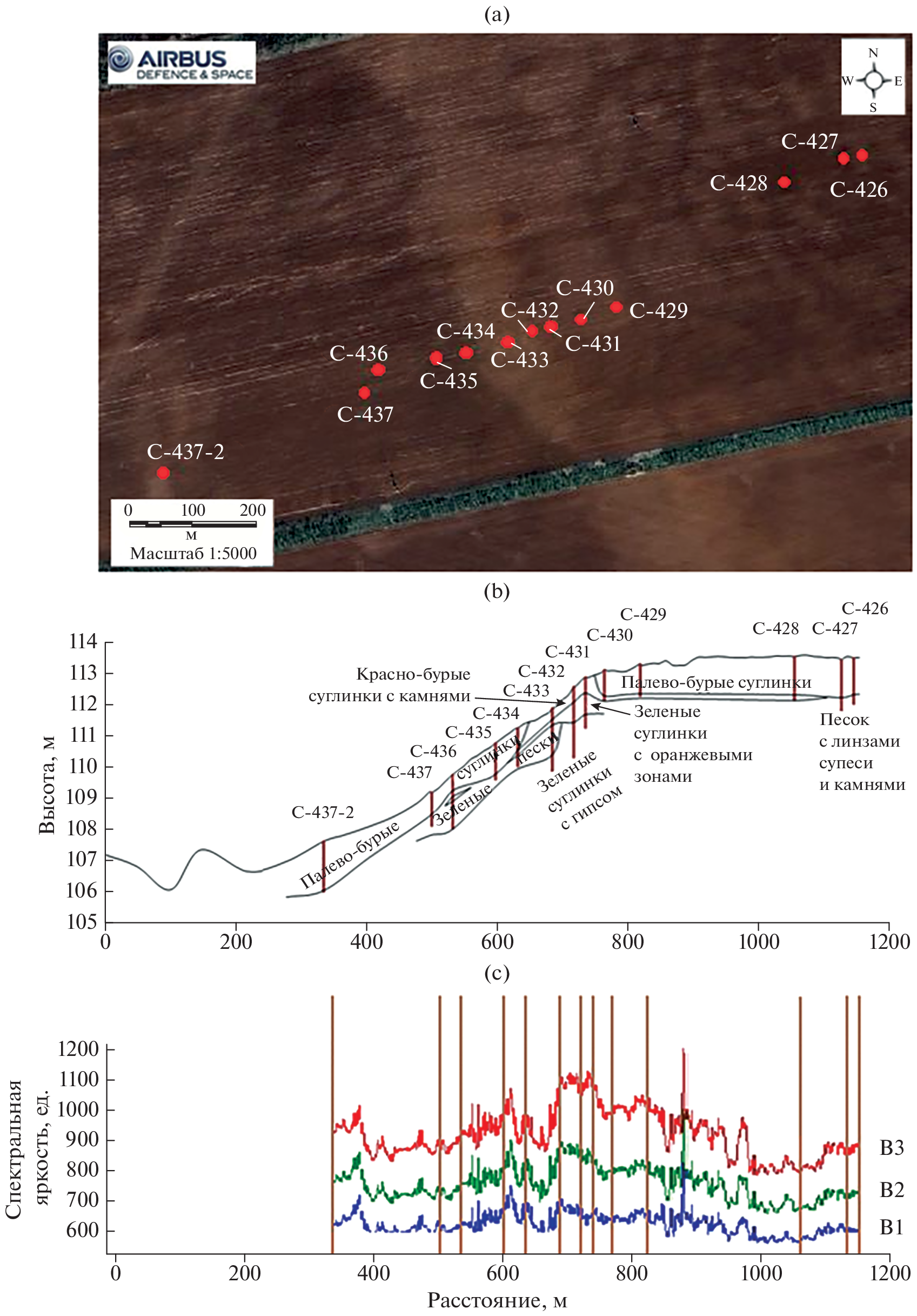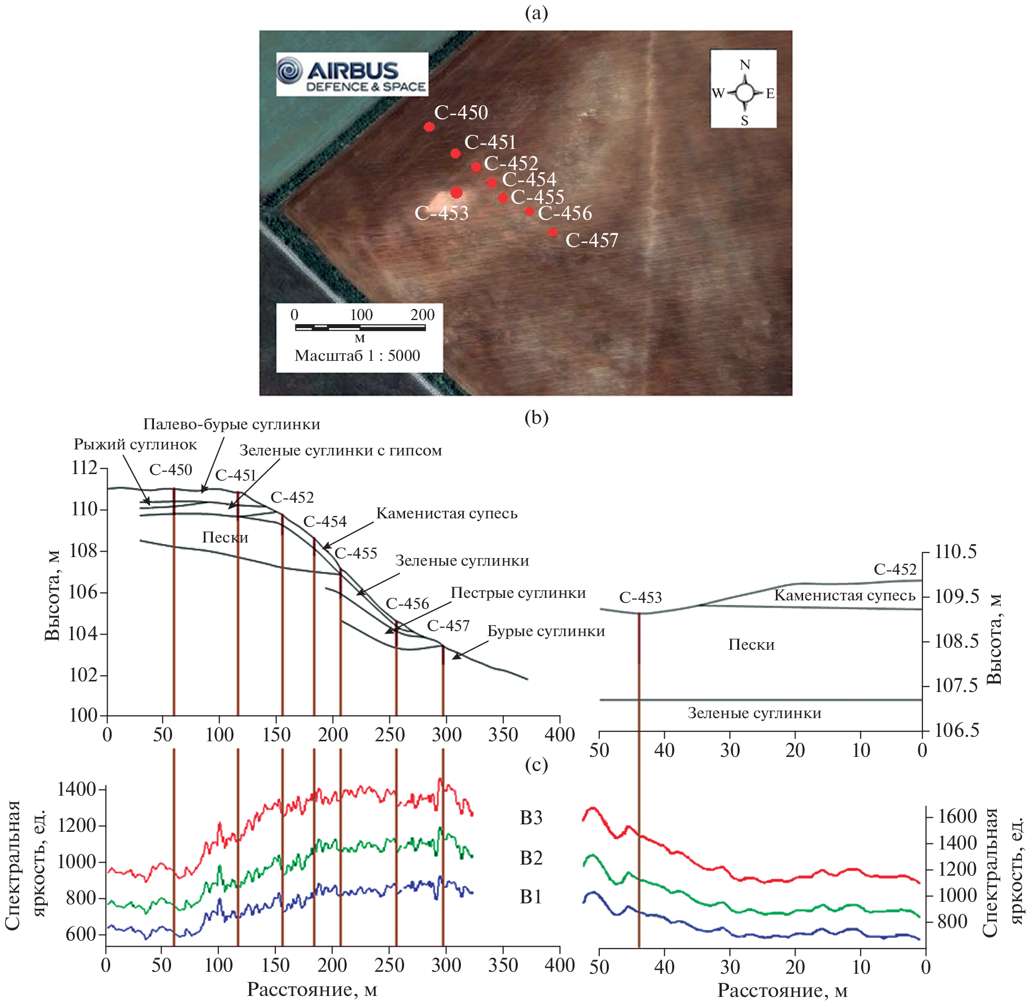 The purpose of the work is to recognize rocky, sandy and calcareous soils from the surface using a multi-zone satellite image in the south of the Volga Upland in the Volgograd oblast. The object of the study was the Volga-Don irrigation system, within the experimental station “Oroshayemaya”. The recognition was carried out by the spectral brightness of the space image of the bare soil surface in 4 bands. The most ranked values among them were marked in B1 band. Three catenae were studied, along which field information about soils was obtained. It was found that the greatest brightness (B1) is created by stones, rubble and sand scattered on the surface (970–1100 units). This is followed by: surface-effervescent soils with strongly rubbled rocks at a depth of about half a meter and sandy loam soils (710–830 units), with effervescence from the soil surface on mottled loams and sands of about half a meter (up to 700 units), and surface-calcareous soils, where mottled loams and sands occur deep (more than 70 cm), or with the absence of calcareous material in the surface horizons, with a brightness of 560–670 units. The use of this approach will enable more detailed recognition of soils on the basis of satellite imagery materials and separate surface-rocky and sandy soils from surface-calcareous soils, which are displayed in images with a similar spotty heterogeneity, but differ in spectral brightness.