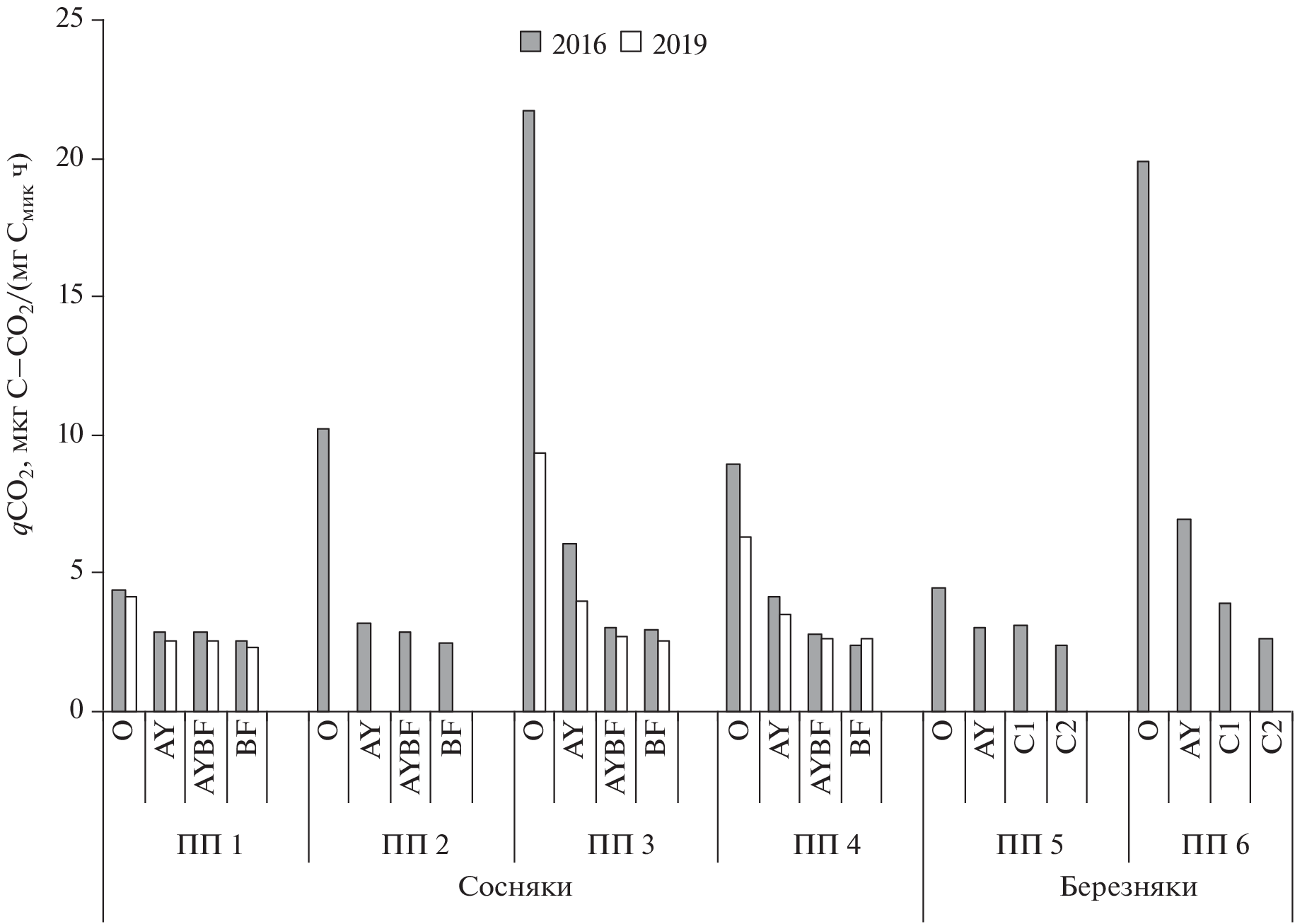 The microbiological and some physico-chemical properties of illuvial-ferruginous soddy-podburs (Entic Rustic Podzols) soils in Scots pine forests and gray-humic typical light loamy soils (Umbrisols) in secondary birch forests of the central regions of the Zabaikal krai have been studied. Fires in soddy-podburs pine forests resulted in decrease in the total exchangeable basis, total nitrogen, mobile forms of potassium and phosphorus, and in increase in the proportion of C : N; while in birch forests, on the contrary, an increase of the mentioned indicators and a narrowing of the C : N proportion in the gray-humic typical soils were observed. The content of humus in the upper soil horizon decreases only in recently burned Scots pine forests after a high-severity fire, while in other sites it increases. A decrease in the soil acidity was observed at all burned sites. High-severity fires lead to a significant decrease in the content of microbial biomass and the intensity of basal respiration, as well as to a change in the structure of ecological and trophic groups of microorganisms in the soils up to a depth of 10 cm of the mineral horizon, while low-severity fires mainly affect the duff. The qCO2 coefficient increased 2–5 times after fires in the duff and 1.5–2 times in the humus horizon only after high-severity fires. In recently burned Scots pine forests, the storage of microbial biomass and microbial production of carbon dioxide significantly decreased up to a depth of 10 cm of the mineral soil layer. In the steppe site formed after the impact of fires in the pine forest, and in the birch forest after a high-severity fire, in the humus horizon the carbon storage of microbial biomass decreased by 15–20%, and the microbial production of CO2 increased by 10–20%, predetermining the predominance of mineralization processes. The considered post-fire transformation of the structural and functional parameters of soil microbiocenosis, as well as a 20–40% decrease in the total carbon storage of microbial biomass in the soils of all sites demonstrate a long recovery period of soils after fires in light coniferous and deciduous forests of the central regions of the Zabaikal krai.