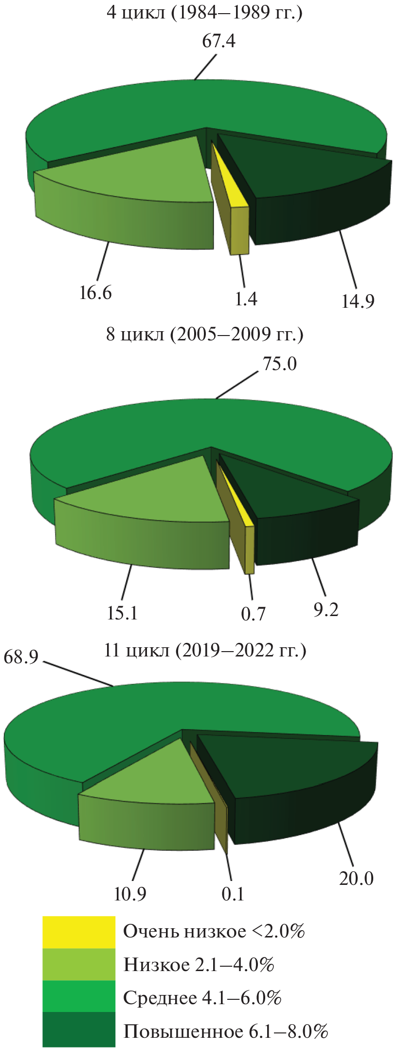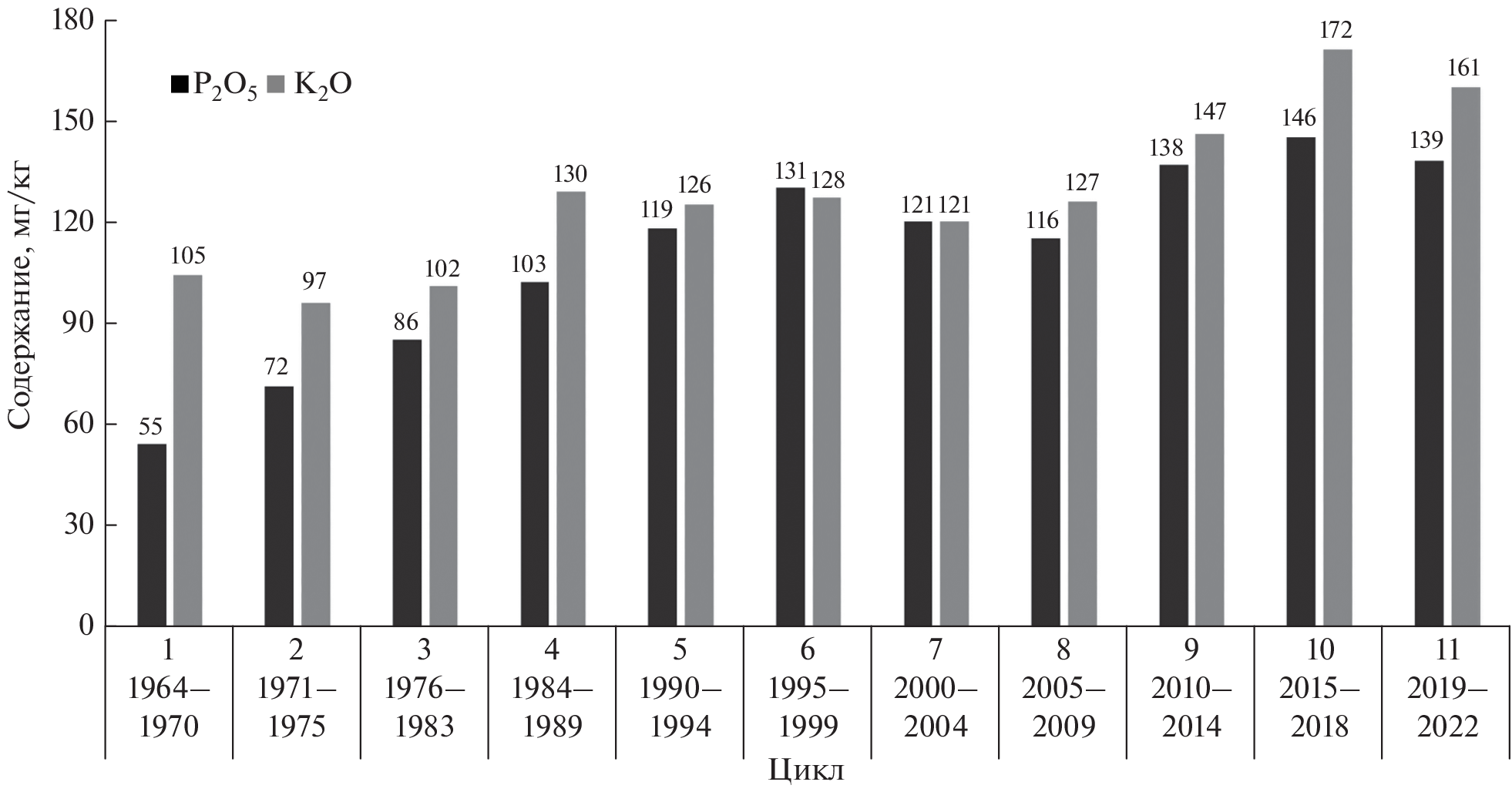 The paper analyzes the results of eleven survey cycles of arable soils conducted from 1964 to 2022 in the southwestern part of the Central Chernozem region in the Belgorod region. In the steppe zone of the region, ordinary chernozems predominate, in the forest-steppe zone – typical and leached chernozems. During the eleventh survey cycle (2019–2022), the average level of application of mineral fertilizers was 114.4 kg a.i./ha, organic – 9.6 t/ha, liming of acidic soils – 43.8 thousand hectares per year. As a result, the average yield of winter wheat increased to 5.09, sugar beet – up to 45.6, corn for grain – up to 7.15 t/ha. At the same time, the maximum value of the weighted average content of organic matter (5.3%) was recorded in the soils of arable land for the entire observation period. The proportion of acidic soils decreased to 28.6%, including moderately acidic soils, to 3.0%. The value of hydrolytic acidity decreased to 2.7 cmolc/kg. The weighted average content of mobile forms of phosphorus (139 mg/kg) and potassium (161 mg/kg) is the highest in the Central Black Earth region. 85.7% of the surveyed soils belong to the category of low content of mobile forms of sulfur, zinc – 97.2, copper – 92.5, cobalt – 98.8, manganese – 40.1, molybdenum – 21.3%. In terms of the content of mobile forms of boron, 98.2% of the soils are classified as highly rich.