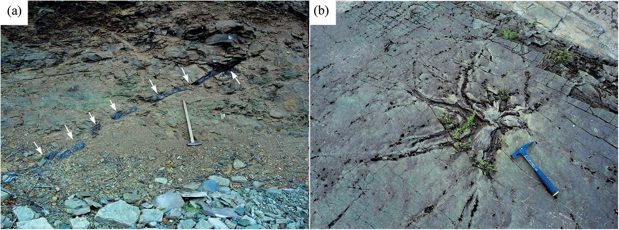 По мере приближения к пролювиальным структурам на фоне увеличения количества красноцветной составляющей появляются трещины усыхания на многочисленных поверхностях напластования пород, отмечаются корытообразные промоины, врезанные в подстилающие породы, характерна высокая насыщенность остатками углефицированных растений от пылеватого детрита до целых стволов деревьев (рис. 2а) [26]. Следует особо отметить, что только в отложениях стыка водоем–суша С. М. Снигиревским в 2020 г. обнаружены крупные корневые системы деревьев (рис. 2b).