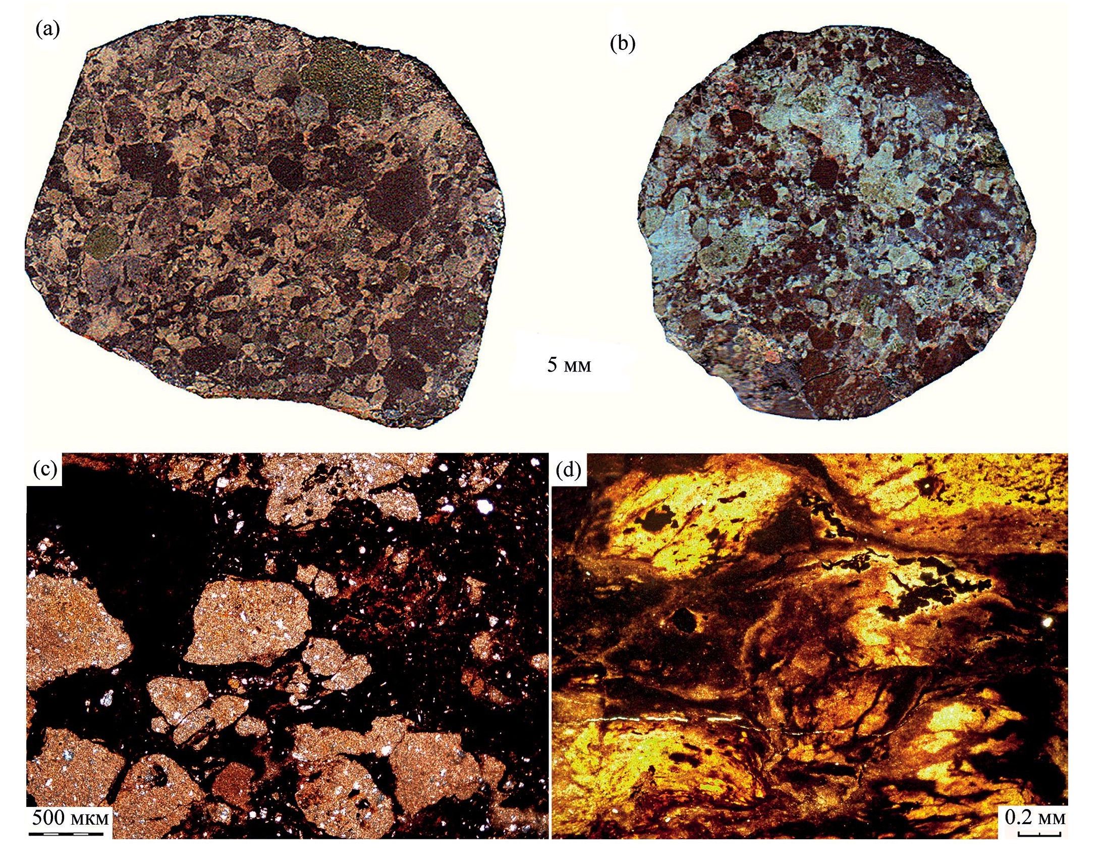 Основной объем пролювиальных построек сложен нелитифицированными легко распускающимися в воде глинистыми породами. Тем не менее, они уплотнены под влиянием литостатического давления, разбиты трещинами кливажа. В шлифованных образцах и петрографических шлифах (изготовленных в сухом режиме) отчетливо видно, что породы сложены разноокрашенными глинистыми обломками размером 1–5 мм в поперечнике, а некоторые достигают диаметра 20 мм. На долю такого обломочного материала приходится до 90% объема породы. Окраска обломков пород варьирует в широких пределах от темно-коричневой до светло-бежевой, почти белой, что придает породе порфировый облик (рис. 3а, 3b). Видимо, разноокрашенные зерна принадлежали разным горизонтам денудированных кор выветривания. Глинистые обломки имеют округлую, реже угловато-округлую форму с хорошо выраженными границами (рис. 3с), чаще их очертания размыты, осложнены заливами, завихрениями, сами обломки выглядят, скорее, комками или сгустками (рис. 3d). Характерной особенностью матрицы является наличие в ней элементов флюидальности, следов полужидкого течения.