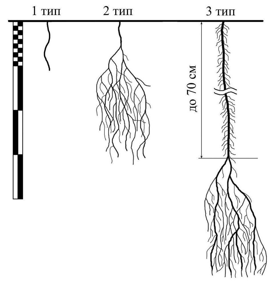В ходе полевых и лабораторных исследований было выделено три морфологических типа корневых систем.