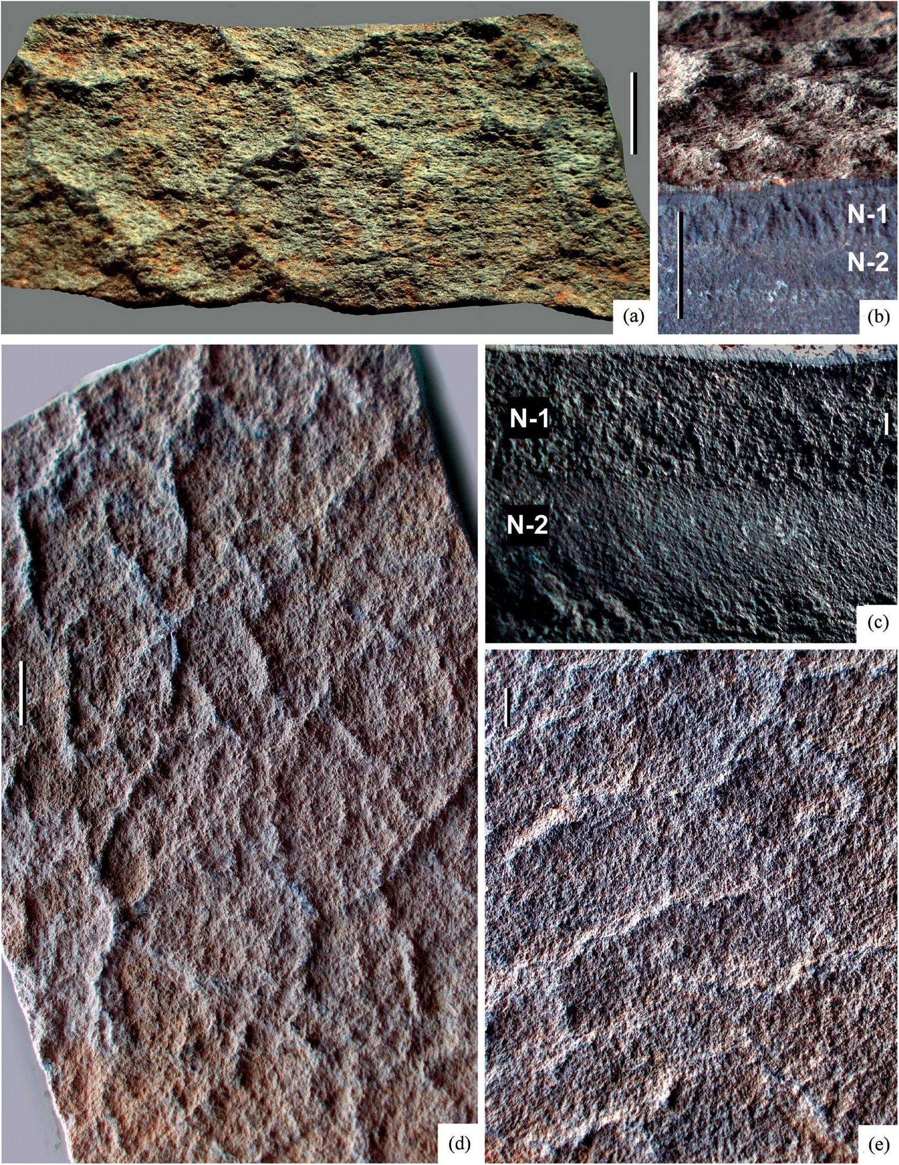 Рис. 2. Ископаемые остатки Cyathotes nigoserica Makarikhin (a, d, e) и строение FPS-профиля (b, c). (а) Цианобактериальный мат (пленка) с крупными ячейками первого порядка и субпараллельными микроморщинками второго порядка; (b) строение палеопочвенного микропрофиля и уровни отбора образцов для аналитических исследований; (c) различия в макростроении условных слоев (генетических горизонтов микропрофиля) палеопочвы и уровни отбора образцов N-1 и N-2; (d) характер морщинистости поверхности цианобактериальной пленки с ячейками двух порядков; (e) характер поверхности с крупными ячейками первого порядка, а также морщинистостью второго порядка, совмещенной с мелкобугорчатым рельефом третьего порядка. Нижний протерозой, ливвий; местонахождение Нигозеро. Длина масштабной линейки – 1 см (a, b, d); 1 мм (c, e).