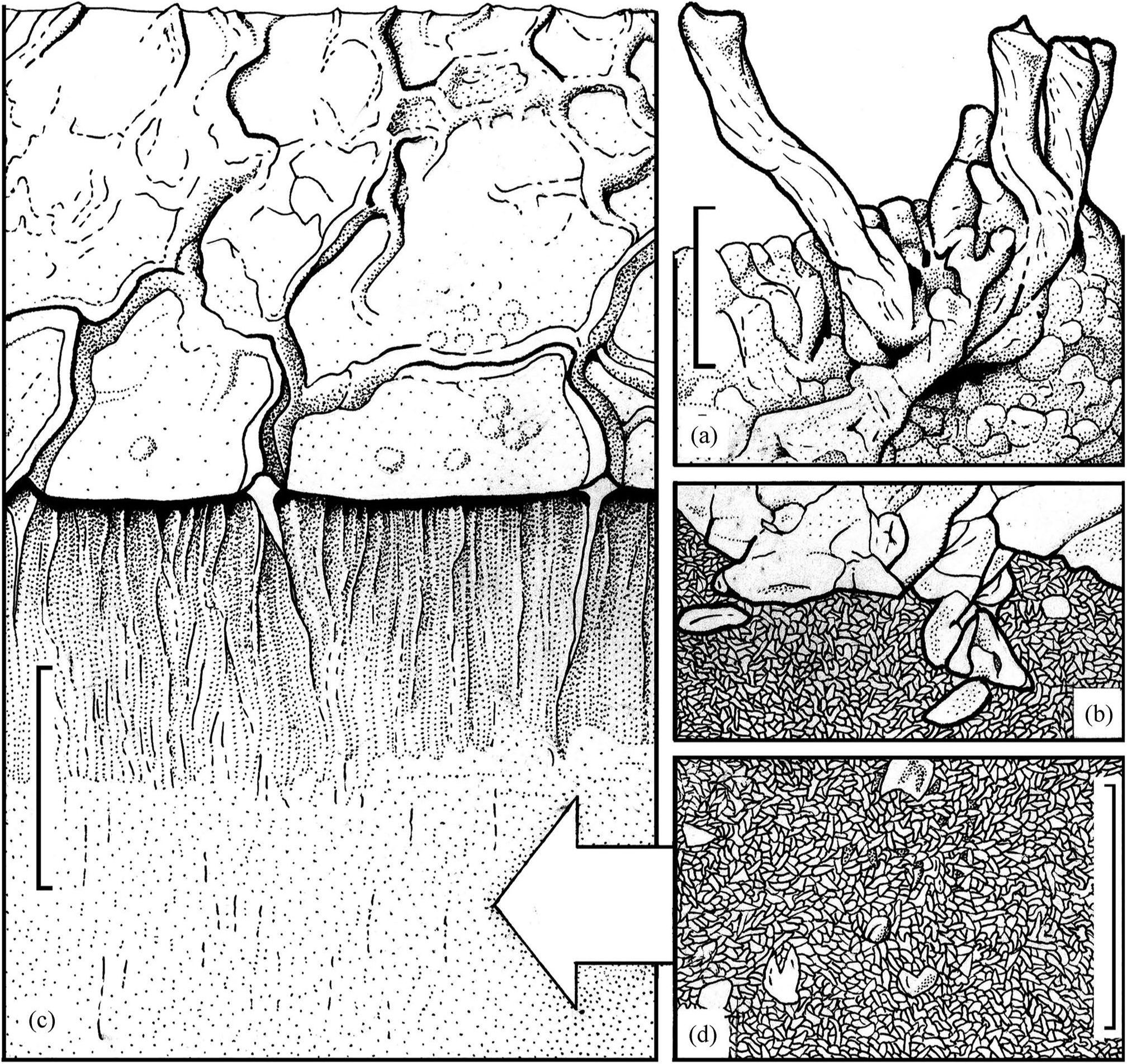 Морщинкам на поверхности пленки соответствуют слепки клиновидных трещин в подстилающем субстрате, при этом, как это было справедливо отмечено в протологе “…вещество, выполняющее трещины, всегда отлично от вещества субстрата, обычно резко от него отграничено” [10, c. 136], что в целом подтверждается и настоящими наблюдениями. Очевидно, эта тонкая пленка, обогащенная органическим веществом, и соответствует поверхности, заселенной цианобактериальным сообществом.