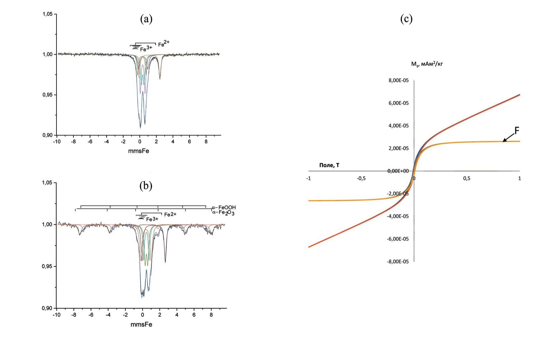 Рис. 2. Пример мессбауэровского спектра, полученного при комнатной температуре (а) и 80 K (b). Пример анализа кривых намагничивания (петля гистерезиса) для валового палеопочвенного образца с расчетной частью ферримагнитной составляющей (F) (c).