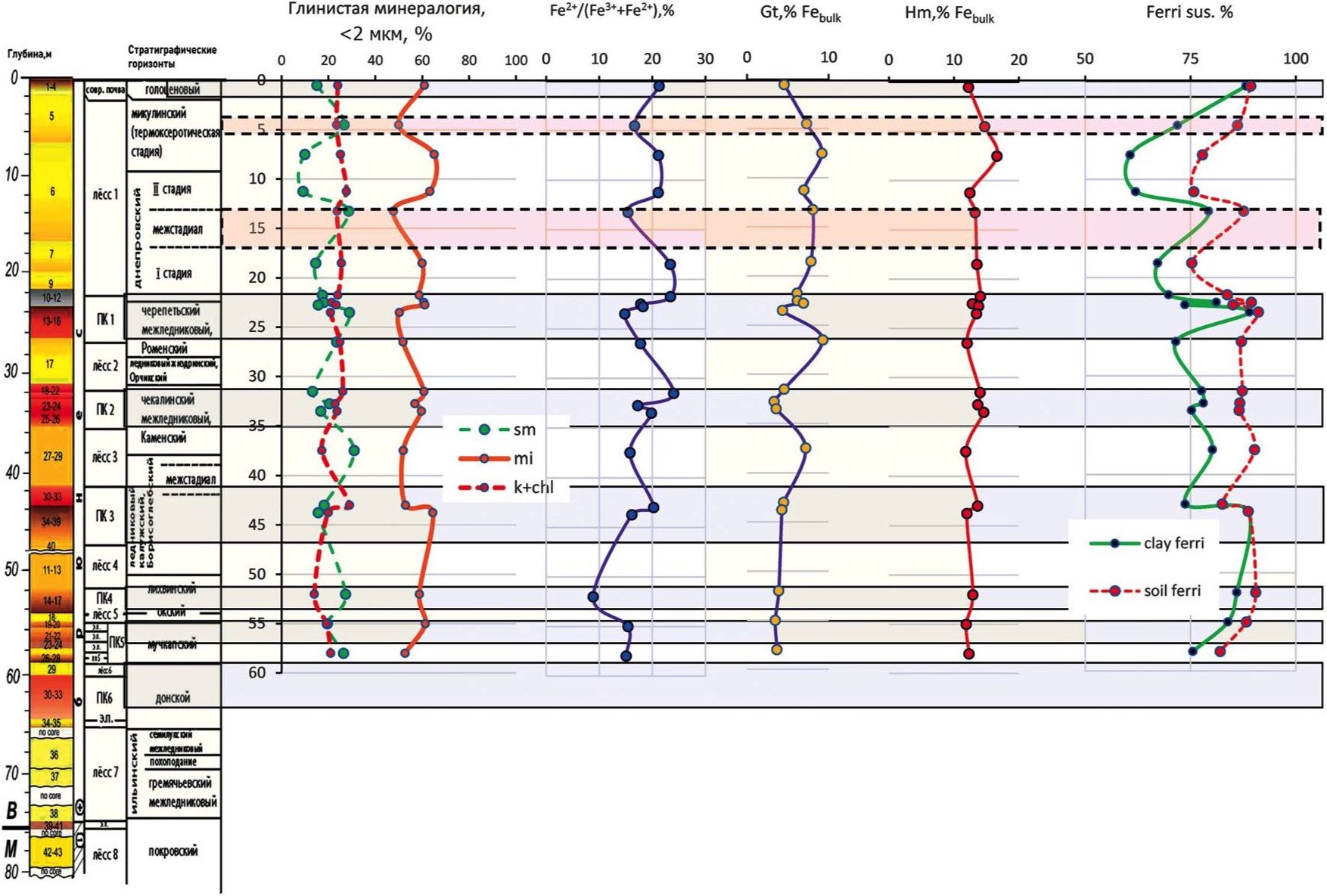 Заметный прирост содержания смектитовой фазы в ПП горизонтах свидетельствует о достаточной длительности этапов почвообразования. Полученные результаты отчетливо фиксируют палеопочвенные горизонты и уверено выделяются микулинское межледниковье (MIS5) и межстадиал днепровского ледникового горизонта (MIS6). К последнему относится слабовыраженная брянская палеопочва, которая была выделена при описании кернов на глубине 13–8–14.5 м сотрудниками Института географии РАН.