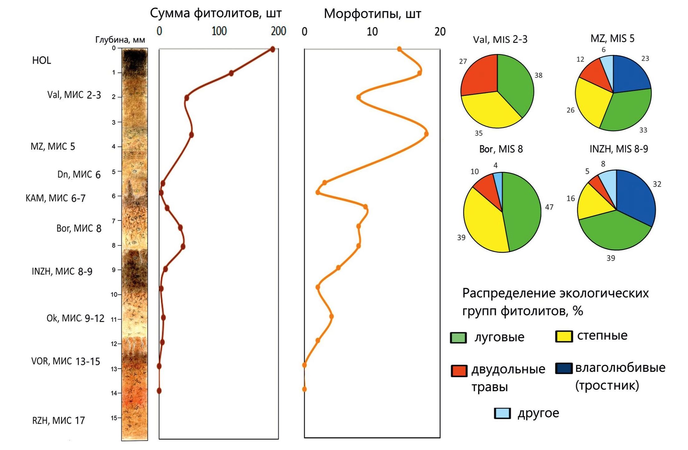 С помощью фитолитного анализа удалось установить преобладание лугово-разнотравных ассоциаций в межледниковые и более остепненных в ледниковые периоды. В течение плейстоцена происходила направленная смена климата в сторону аридизации, при которой в межледниковые периоды снижалось среднее годовое количество атмосферных осадков (с 600 до 550 мм/год), нарастала ксерофитизация растительных сообществ, снижался уровень биопродуктивности и ландшафтного разнообразия. Из-за поднятия грунтовых вод в межледниковые периоды активизировались локальные процессы гидроморфизма, результатом было широкое развитие тростниковых сообществ. В ледниковые периоды среднее годовое количество атмосферных осадков уменьшалось до 200–250 мм/год, а более влаголюбивая часть злаков и тростниковая растительность исчезала.