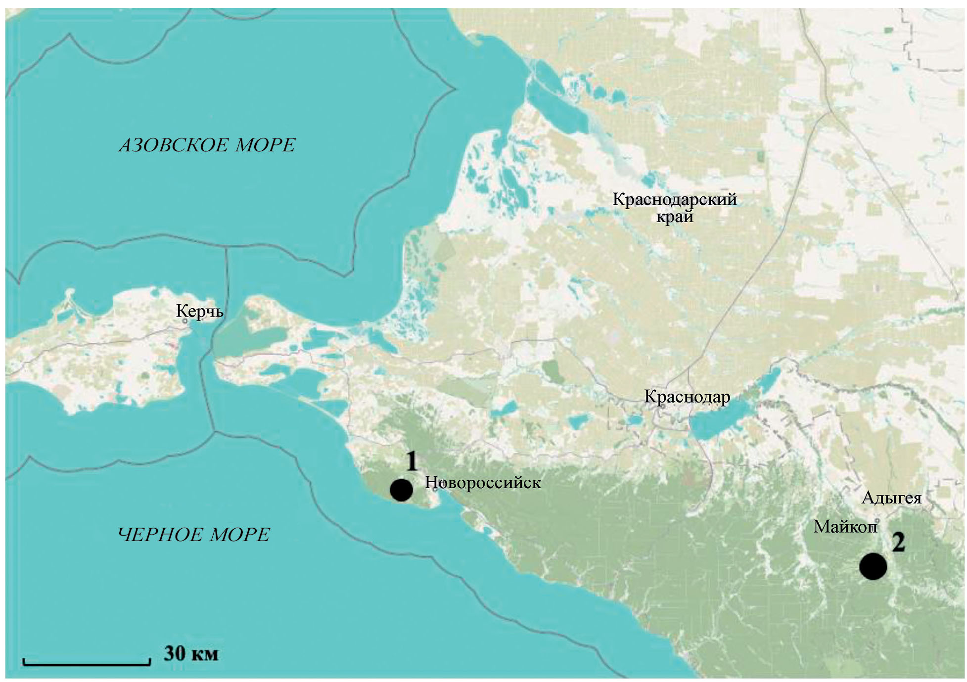 Рис. 1. Картосхема местоположения исследуемых участков: 1 – государственный природный заповедник “Утриш”, 2 – Хамышинское лесничество.