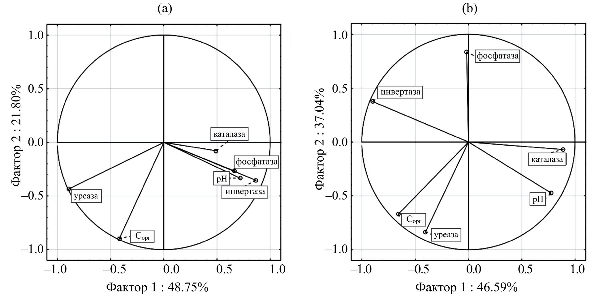 Представлены графики факторных координат для изученных показателей в слое 0–3 см для коричневых почв (рис. 4а) и бурозема (рис. 4b). Так как данный анализ основан на корреляциях, значения координаты не превышают 1.0. Все переменные расположены близко к линии единичной окружности, особенно каталаза, фосфатаза, инвертаза и рН, следовательно, можно сделать вывод, что в системе найденных координат они воспроизводятся хорошо (рис. 4а). При этом факторы 1 и 2 объясняют 71% общей дисперсии. Видно, что с увеличением значений реакции почвенной среды увеличивается активность таких ферментов, как каталаза, инвертаза и фосфатаза. При этом для уреазы связь полностью противоположна.
