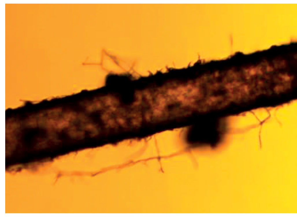 Рис. 5. Кератинофильные грибы солоидов Ахштырской пещеры на волосе современного человека, используемого в качестве приманки.