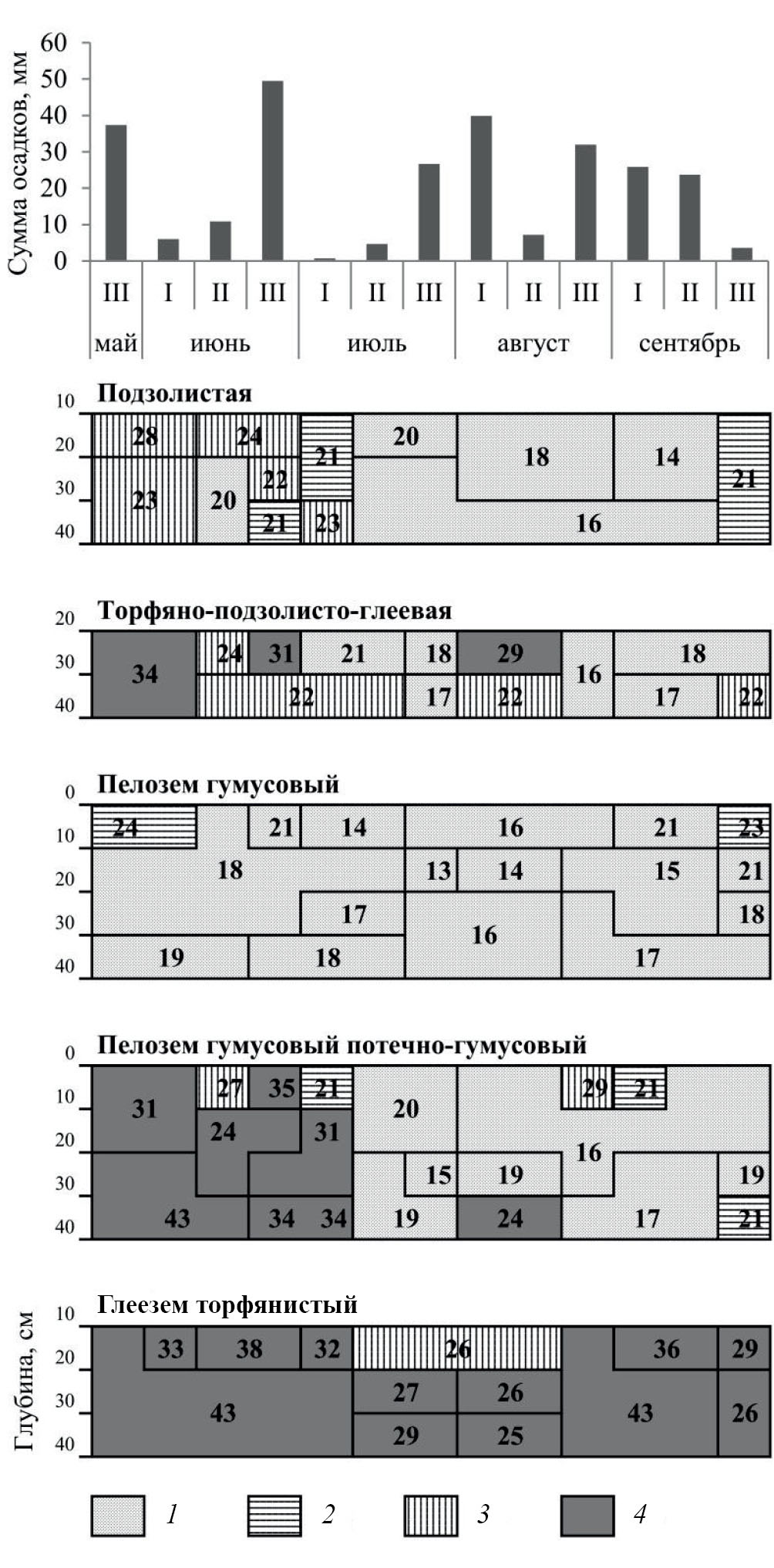 Примечание: цифры на прямоугольных рисунках означают полевую влажность (мас. %).
