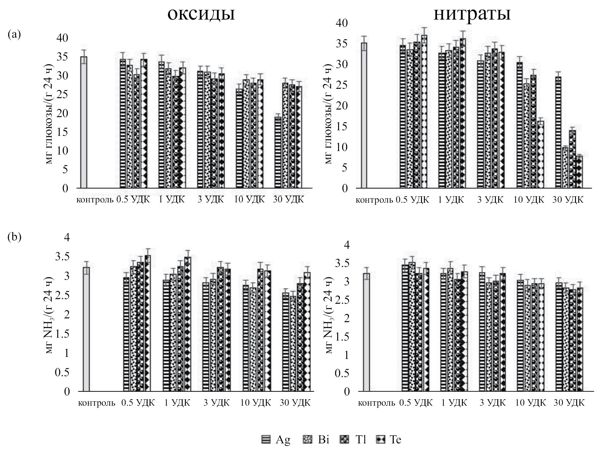 Рис. 4. Изменение активности ферментов класса гидролазы при загрязнении чернозема обыкновенного оксидами и нитратами Ag, Bi, Tl и Te: a – инвертаза (мг глюкозы/(г 24 ч)); b – уреаза (мг NH3/(г 24 ч)).