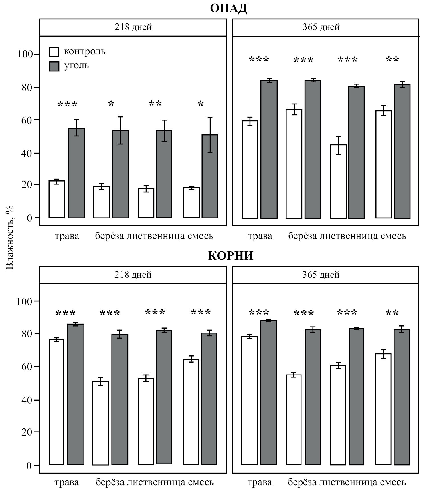 Рис. 2. Влияние угля на влажность опада и корней за изучаемый период. Данные представлены средними значениями (n = 7), планки погрешностей отображают ±1SE. Значимое влияние угля в отдельных вариантах эксперимента обозначено (*) соответственно значениям p: *** <0.001, ** <0.01, * <0.05.