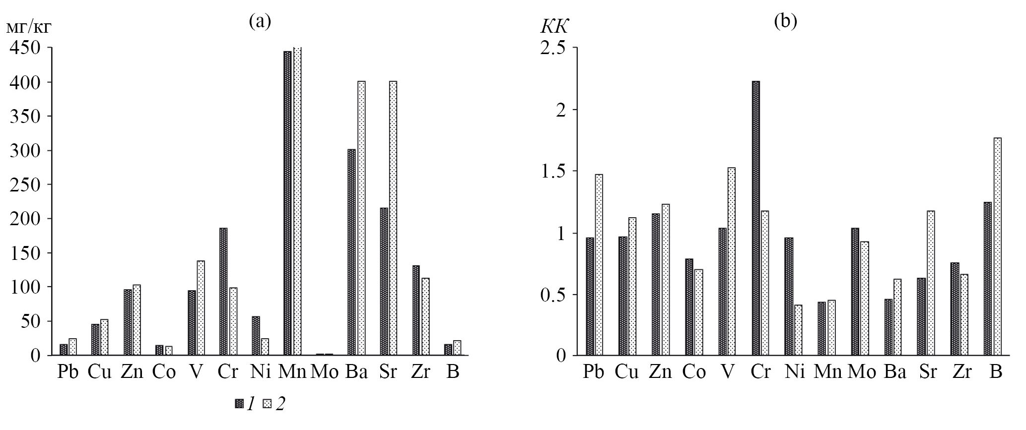 По сравнению со средним содержанием в литосфере в пределах подтаежного и подтаежно-лесостепного лесорастительного пояса остаточные и переотложенные коры выветривания магматических пород обогащены Zn, Cr, Mo, B, в то же время в них меньше Pb, Co, Mn, Ba, Sr, Zr, о чем свидетельствуют коэффициенты концентрации (рис. 1b).