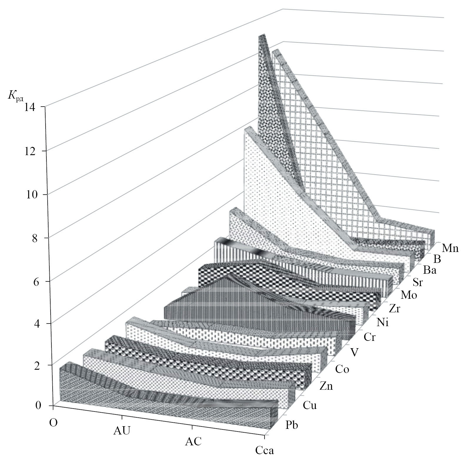 Относительно почвообразующей породы, в органогенных горизонтах рассматриваемых почв наблюдается резкая аккумуляция элементов биофилов: B (Крд = 12.97), Mn (Крд = 11.67) и Ba (Крд = 7.81). Для Sr и Mo характерна относительно меньшая концентрация (Крд = 2.27–3.43). Еще меньшей аккумуляцией в этом горизонте обладают Pb (Крд = 1.58), Co (Крд = 1.40), Cu (Крд = 1.38), Zr (Крд = 1.33) и Zn (Крд = 1.22). Наблюдается обеднение органогенных горизонтов V, Cr и Ni (рис. 5).
