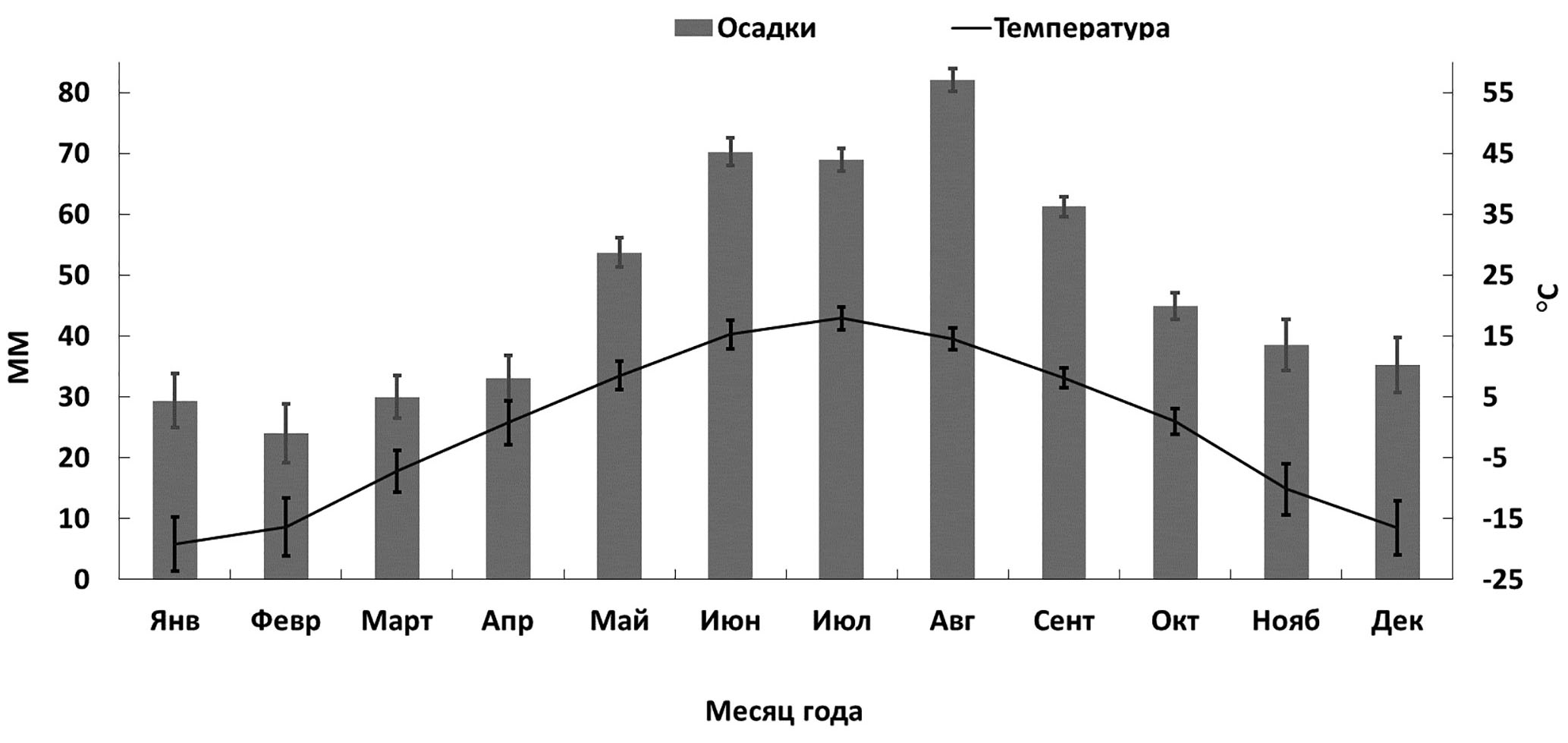Метеорологические условия. Средние многолетние значения температуры воздуха и количества осадков за период с 1991 по 2022 гг., основанные на результатах измерений трех метеорологических станций: Ханты-Мансийск, Ивдель и Угут, показаны на рис. 2. Наиболее холодный месяц, с наименьшим среднемесячным значением температуры (–19.2 ± 4.4°C) – январь, а самый жаркий месяц, на который приходится пик вегетационной активности, с максимальной среднемесячной температурой 18.0 ± 1.9°C – июль. Средние температуры выше 5°C наблюдаются с мая по сентябрь, что говорит о достаточно непродолжительном периоде вегетации. Годовое количество осадков сильно варьировало в отдельные годы в течение зимнего (ноябрь–февраль) и летнего (май–август) периодов: от 39 ± 6.8 до 24 ± 2.3 мм и от 54 ± 4.2 до 82 ± 4.5 мм соответственно. Наименьшее количество осадков приходится на февраль, а максимальное – на август. Средняя температура воздуха в мае 2022 г. составила 11.2 ± 2.4°C, в июне – 13.6 ± 2.3°C, в июле – 18.2 ± 1.9°C, что с учетом стандартного отклонения совпадает со средними значениями многолетних наблюдений. В период проведения измерений сумма осадков в мае составила 69 ± 4.2 мм, в июне 57 ± 5.7 мм, что в среднем незначительно отличается от многолетних наблюдений. В июле сумма осадков составила катастрофически малые 6.0 мм, что в 11 раз меньше среднемноголетнего значения. Подобные аномально засушливые месяцы периодически фиксируются на территории ХМАО: например, в июле 2013 г. на метеостанции Угут отмечено весьма незначительное количество осадков – 7.4 мм.