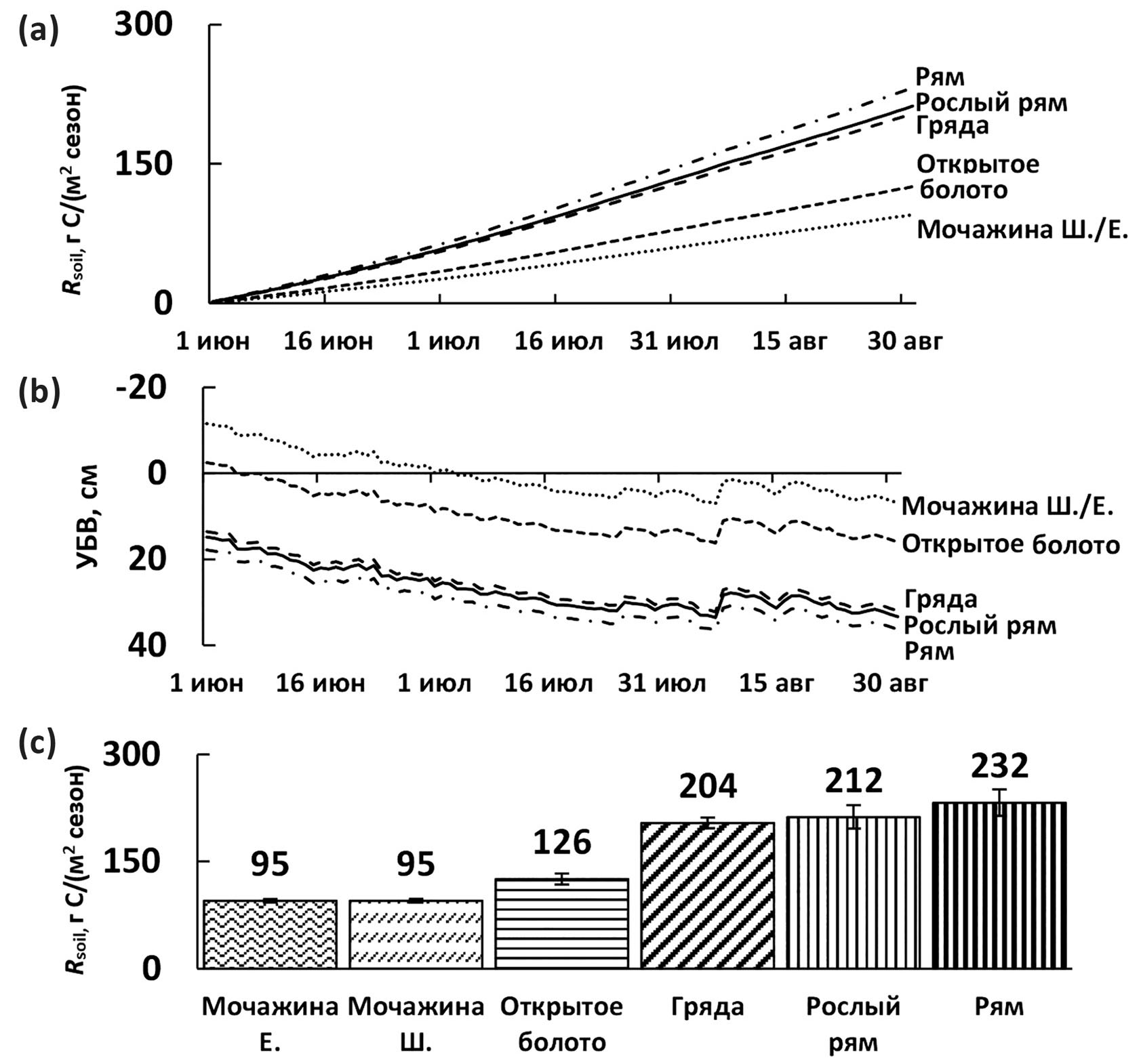 Почвенное дыхание росло в течение сезона во всех биотопах с июня по август по мере падения УБВ: в большей степени на участках рям, рослый рям и открытое болото. Гряда, мочажина Ш и мочажина Е характеризовались более стабильными условиями увлажнения и, соответственно, практически линейным изменением кумулятивной кривой дыхания почвы в течение сезона. Вероятно, близость к окраинным участкам болотного массива (где расположены рям, рослый рям и открытое болото) в условиях недостатка атмосферных осадков обусловливает более резкое снижение УБВ, чем в его центральных частях.