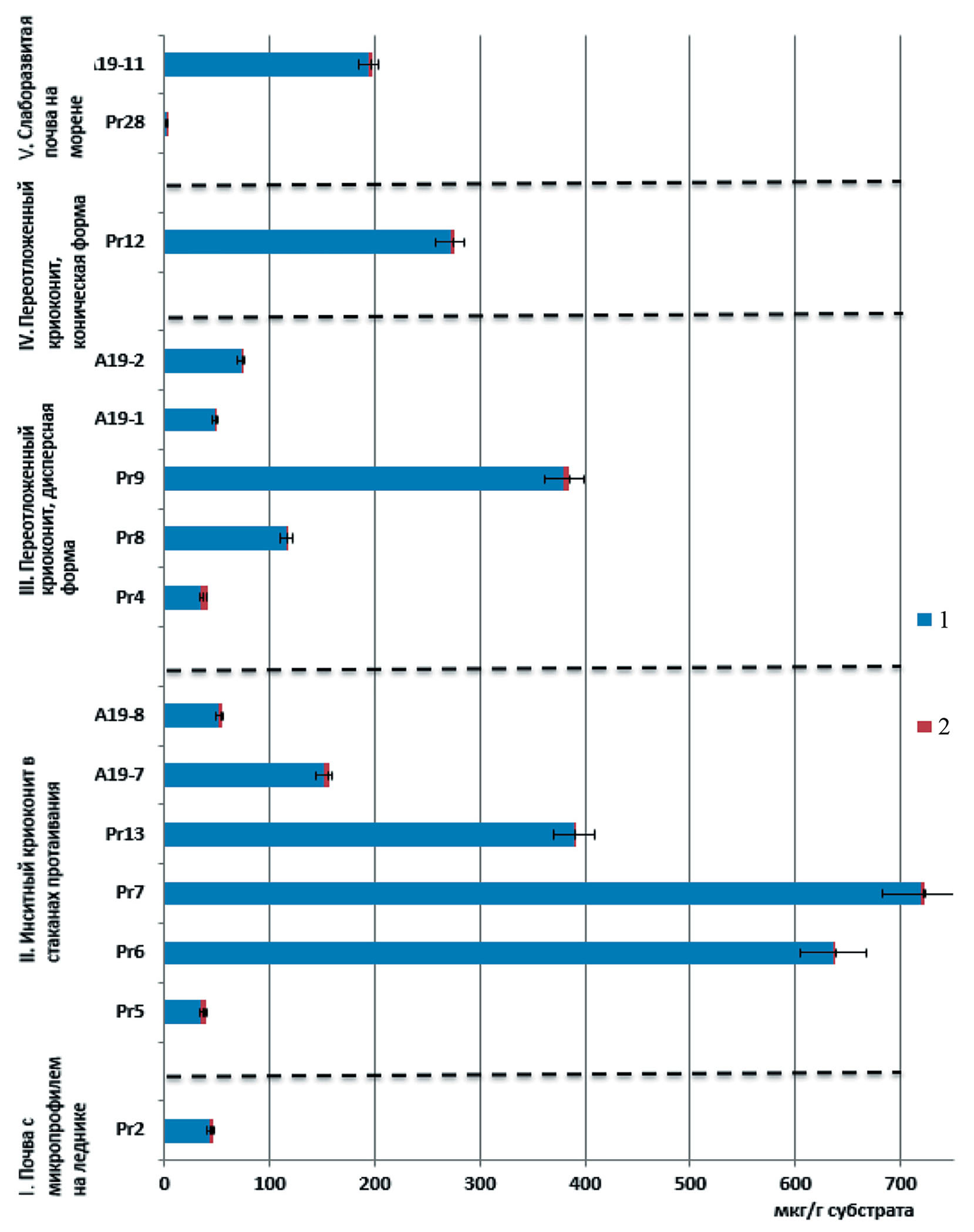 Суммарная биомасса микроорганизмов (грибов и бактерий) составляла от 2.54 мкг/г субстрата в слаборазвитой почве, сформированной на морене с участием криоконитового материала (образец Pr28), до 722.0 мкг/г субстрата в образце инситного криоконита в стакане протаивания (образец Pr7) (рис. 2). Для образцов инситного (Pr4, Pr5, A19-1, A19-2 и A19-8) биомасса микроорганизмов составляла десятки мкг/г субстрата, а для образцов Pr6, Pr7, Pr8, Pr9, Pr12, Pr13, A19-7 и A19-11 – сотни мкг/г субстрата. В целом наблюдалась тенденция уменьшения суммарной микробной биомассы в ряду: группа I почва с микропрофилем на леднике > группа V слаборазвитая почва на морене > группа IV переотложенный криоконит конической формы > группа III переотложенный дисперсный криоконит > группа II инситный криоконит в стаканах протаивания.