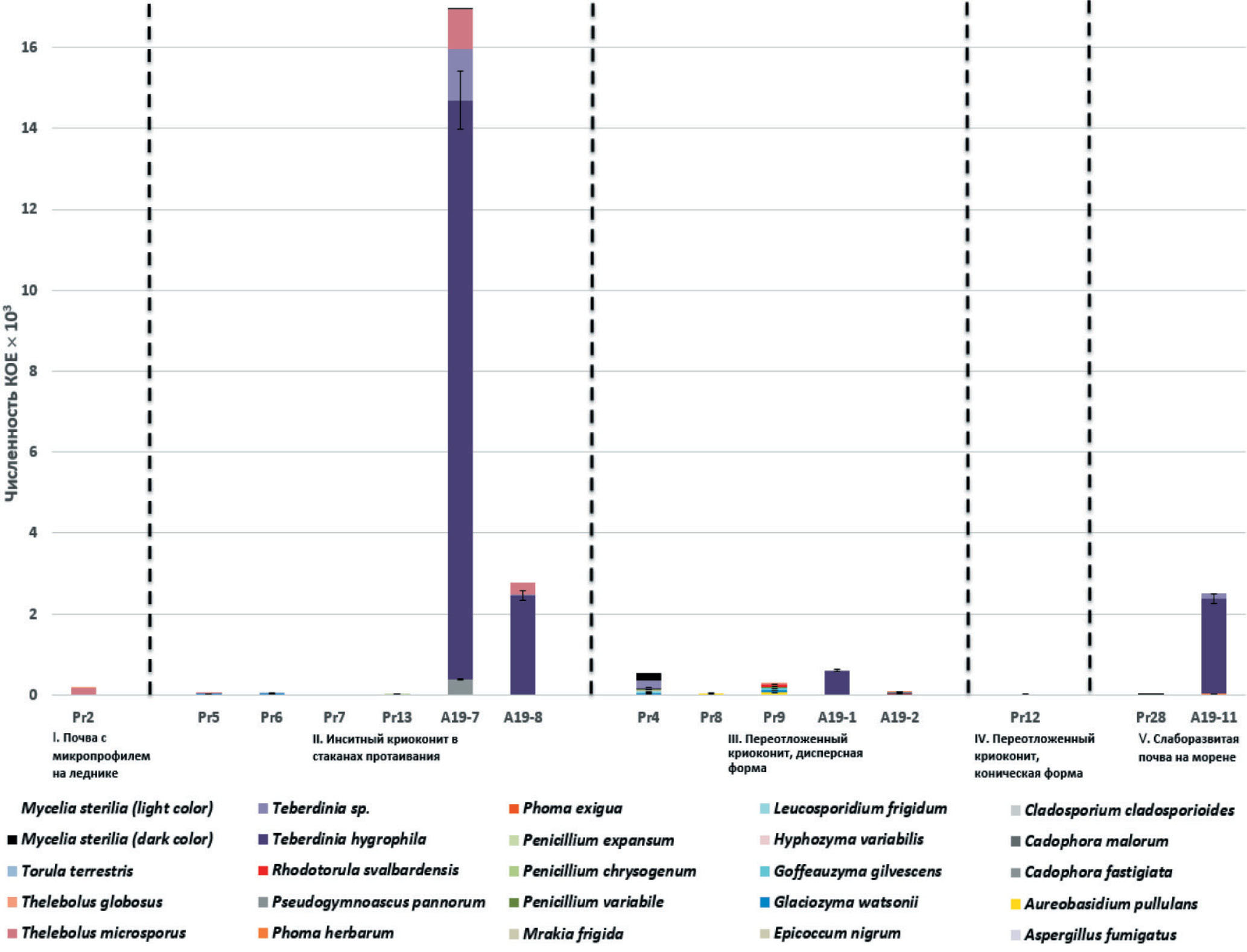 - Singh P., Singh S.M. Characterisation of yeasts and filamentous fungi isolated from cryoconite holes of Svalbard, Arctic // Polar Biol. 2012. V. 35. P. 575–583. https://doi.org/10.1007/s00300-011-1103-1