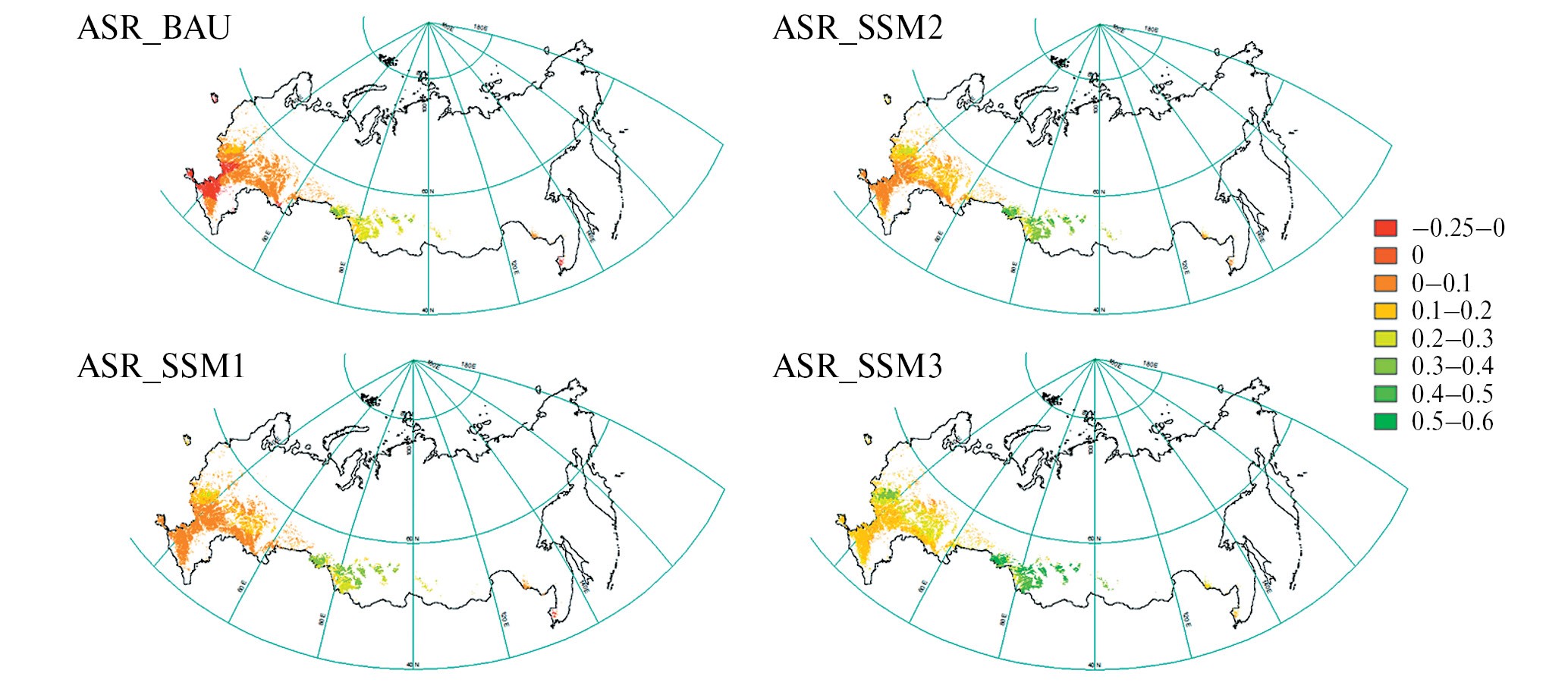 Далее были получены три карты относительной скорости секвестрации почвенного углерода (RSR) [27], как разница ASR за период в 2020–2040 гг. по сценарию SSM1,2,3 по сравнению с неизменным хозяйствованием (BAU).