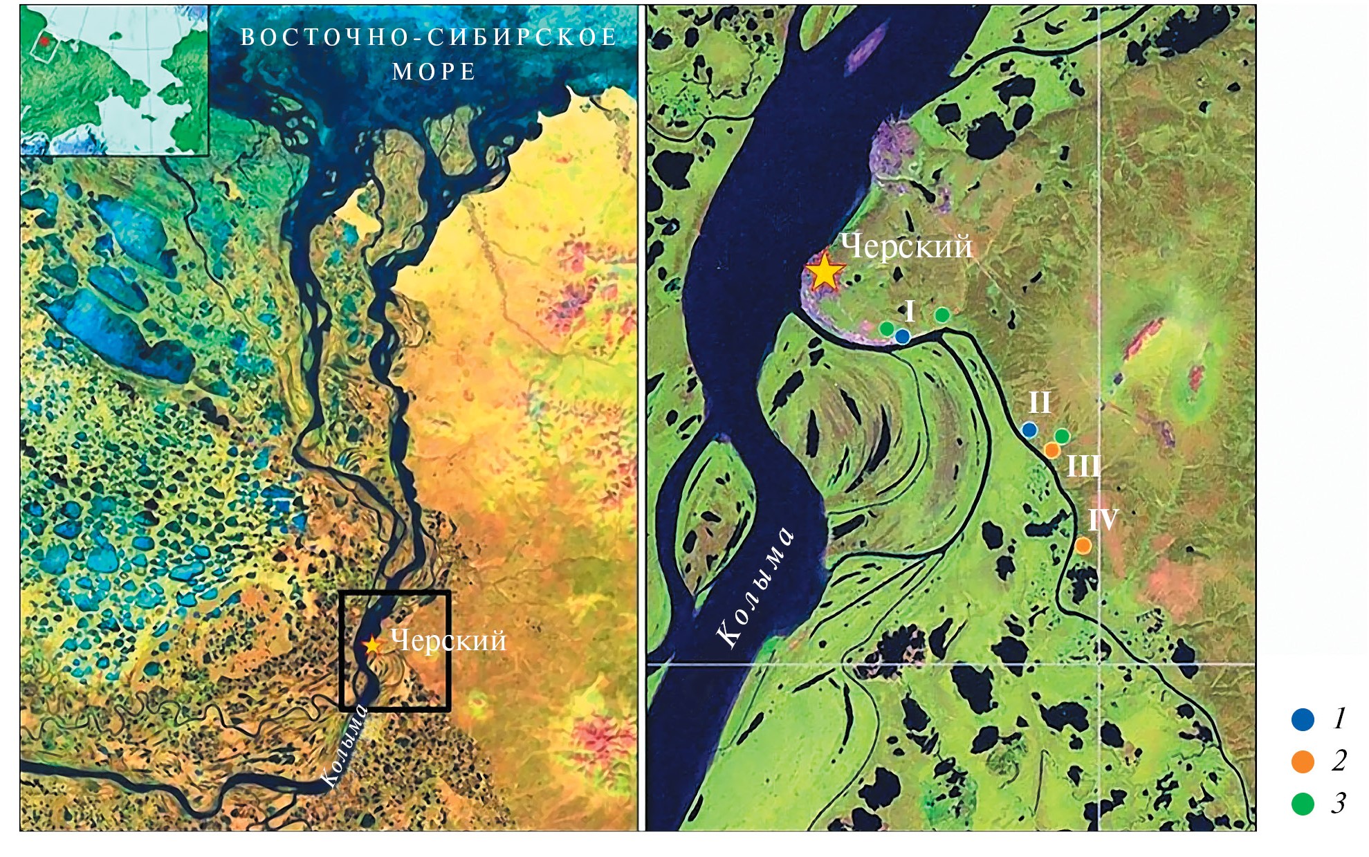 Регион и объекты исследования. По данным метеостанции Черский, среднегодовая температура воздуха изменяется от –10.5 до –7.3°С1. Средняя температура июля составляет 10.4–16.2°С, а января –35.9…–30.1°С. Величина годовой амплитуды температур колеблется в пределах 46.0–49.2°С. Климат может быть охарактеризован как среднеконтинентальный, степень континентальности по Иванову (202) близка к верхнему пределу значений для этой области. Период положительных среднесуточных температур – 115–145 сут. По количеству осадков (171–322 мм) климат умеренно сухой. В теплое время года выпадает 65–174 мм. Величина коэффициента увлажнения для летнего периода равна 0.7–0.8. Наблюдается повсеместное распространение многолетней мерзлоты.
