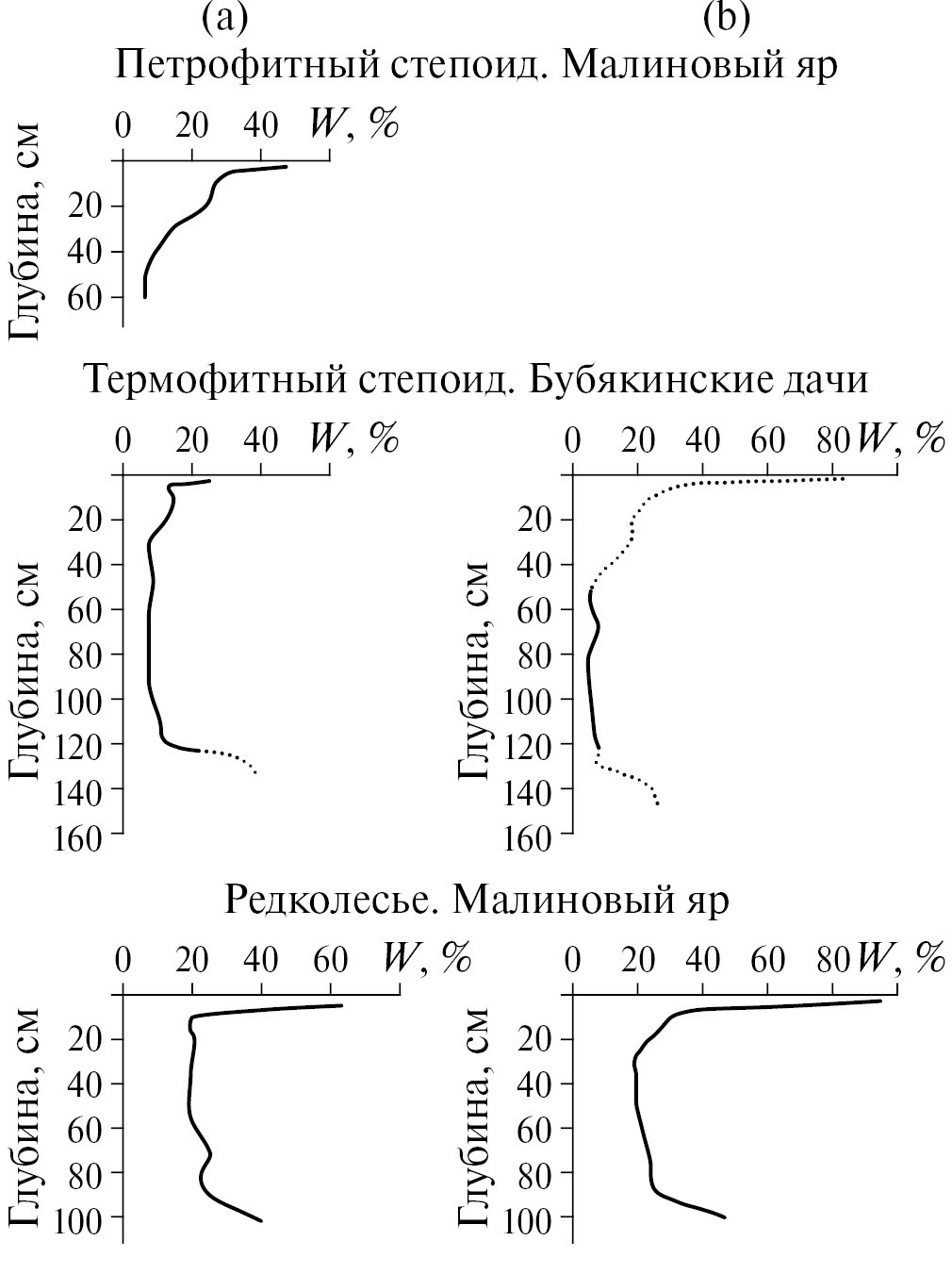 В случае термофитных степоидов значения почвенной влажности обычно составляют 5.0–10.0%. У подошвы СТС отмечается увеличение содержания влаги до 8.0–15.5% (рис. 2), а в одном из профилей – даже надмерзлотная глееватость (разрез 35-85). Во время редких дождей почвы остепненных участков обычно промачиваются лишь до 25–30 см, а в периоды максимального летнего иссушения их влажность может снижаться до 3.3–4.0%. Сухость профиля исключает протекание элювиальных процессов и обусловливает преобладание восходящих токов почвенного раствора на протяжении всего теплого сезона или большей его части. То же направление миграции сохраняется в начале зимы, когда подтягиваемая к фронту промерзания влага способствует увеличению льдистости верхних горизонтов до 20–40, а в случае дождливой осени – до 45–50%. Иссушения льдистой материнской породы при этом не происходит. Потери влаги за теплый период, по-видимому, компенсируются за счет осенней верховодки, мигрирующей с водоразделов по кровле многолетней мерзлоты.