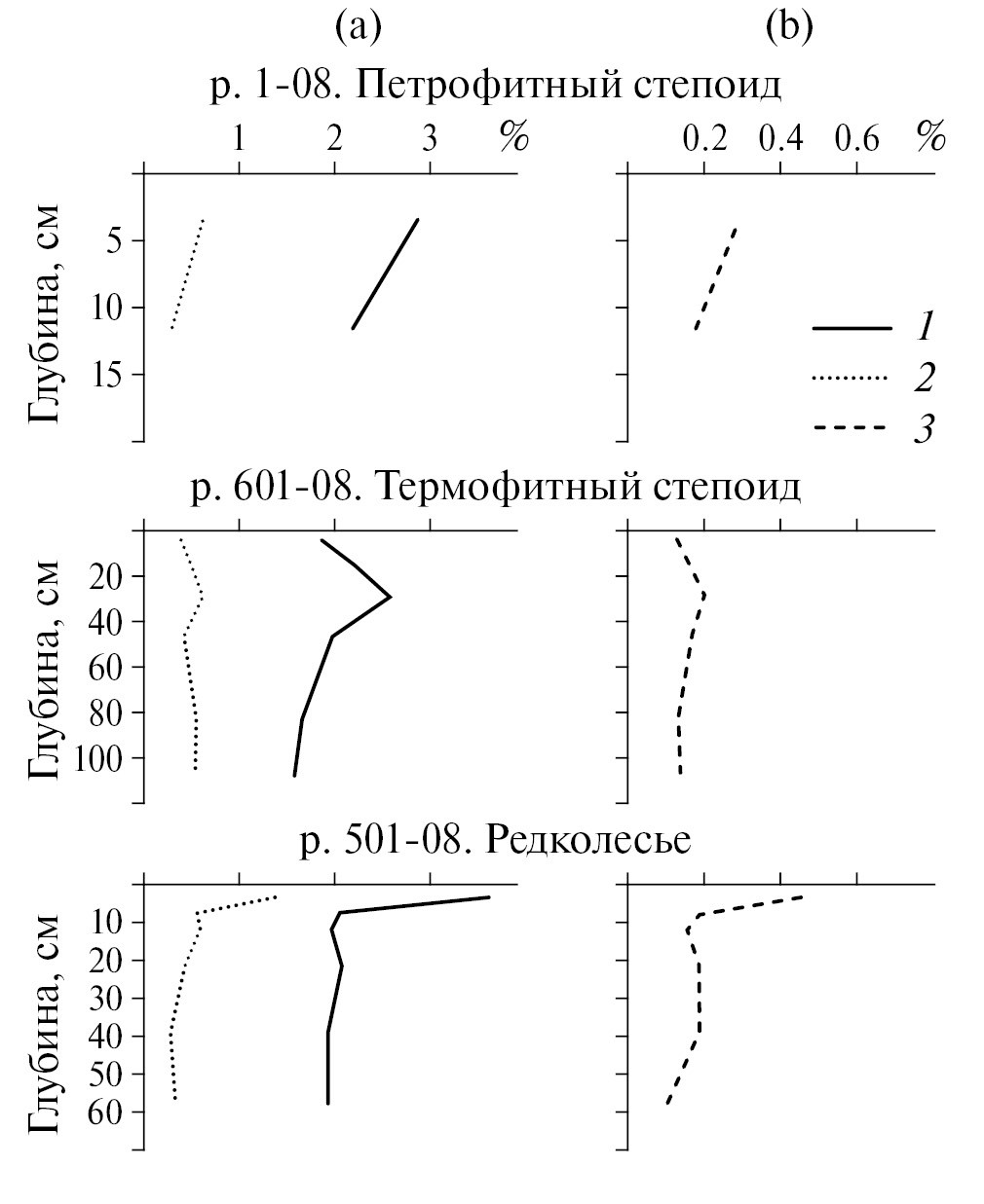 Степное почвообразование способствует накоплению азота. В почве под термофитным степоидом его валовые концентрации по средневзвешенным данным для органо-аккумулятивных горизонтов в 3.0. а для минеральных – в 1.4 раза выше, чем в лесной почве. Доли аммонийной и нитратной форм ничтожно малы (0.2–0.9% от валового содержания азота), азот почти полностью связан с органическим веществом. Диапазон молярных отношений С/N в изучаемых профилях составляет 9.7–13.8. Близкие значения приводятся, например, для почв остепненных участков в бассейне среднего течения Индигирки [39].