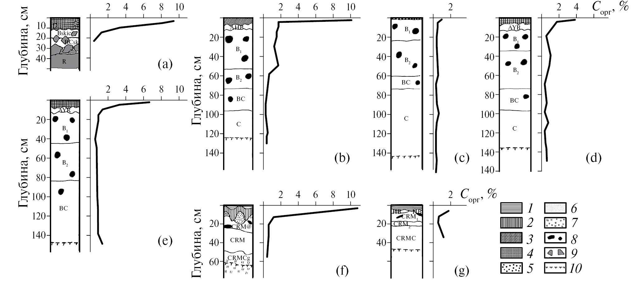 В почвенном покрове наиболее дренированные позиции заняты разнообразными криометаморфическими почвами, представляющими собой зональные разности. На изучаемой территории широко распространен подтип криометаморфических палево-метаморфизованных почв, в верхней части профиля которых присутствует грубогумусовый или перегнойный горизонт, обычно с крупноволнистой, языковатой или карманистой нижней границей за счет криогенных процессов. Структура минеральных горизонтов почв чешуйчатая или листовато-чешуйчатая, явно криогенной природы, что дает возможность отнести их к криометаморфическим (CRM). Под органо-аккумулятивными горизонтами выражен фрагментарный или прерывистый палевый горизонт (CRMpl), нередко имеющий неоднородную окраску с субгоризонтальной ориентацией морфонов, которую мы склонны связывать с проникновением материала по корням лиственницы. Наличие палевого горизонта часто сочетается с проявлением слабых признаков оглеения, как в верхней части профиля, так и у подошвы деятельного слоя. Во многих профилях наблюдаются разорванность минеральных горизонтов и наличие линз криотурбационного или занесенного при ветровалах грубого органического вещества.
