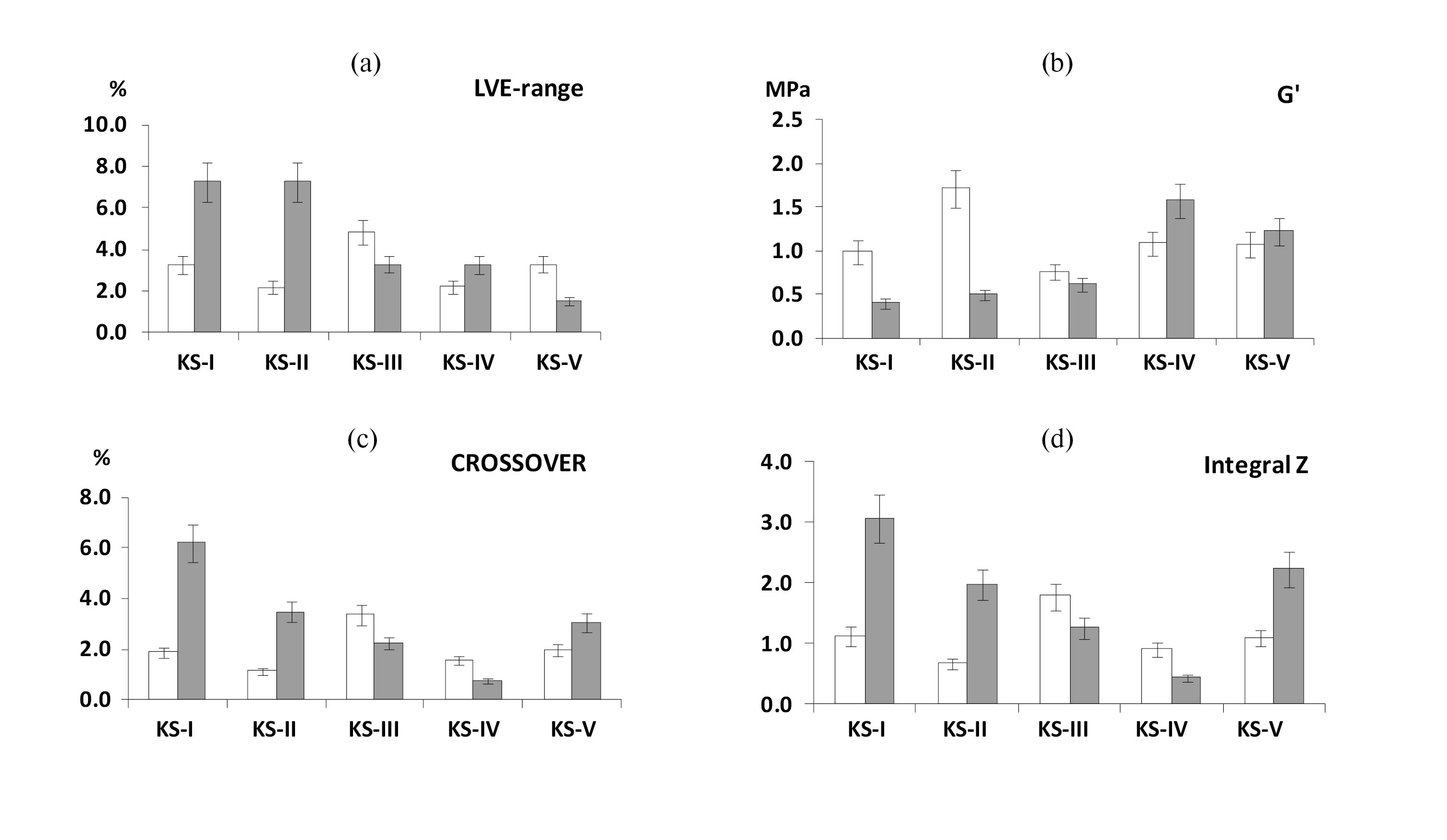 Рис. 2. Распределение реологических параметров (a – LVE-range, %, b – G’, MПa, c – Crossover, %, d – Integral Z) в текстурно-дифференцированных и криометаморфических горизонтах почв ключевых участков разных подзон: KS-I – южная тайга (горизонт ВТ), KS-II – средняя тайга (горизонт ВТ), KS-III – северная тайга (горизонт CRM), KS-IV – крайне северная тайга (горизонт CRM), KS-V – лесотундра (горизонт CRM)