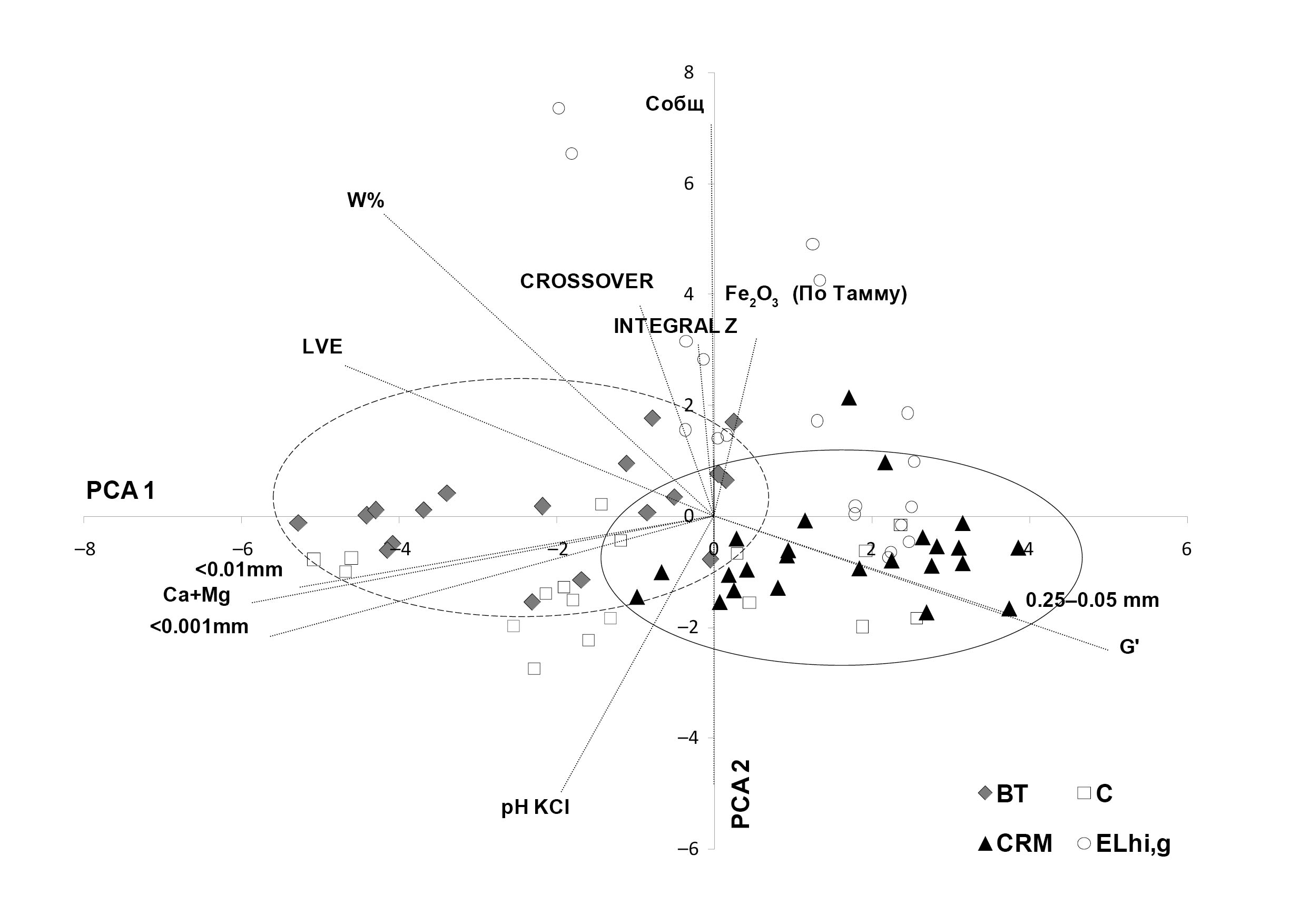 Рис. 4. Результаты PCA ординации основных диагностических почвенных горизонтов (ELhi,g, ВТ, CRM, С) с использованием матрицы парных корреляций. Доля объясненной дисперсии для РСА1 – 32%, для РСА2 – 19%. Вектор корреляции – указывает на реологический параметр (G’, Integral Z, Crossover, LVE), с которым наиболее тесно коррелируют физико-химические свойства исследуемых горизонтов почв, что визуально отражается на графике в виде их группировки в направлении вектора корреляции