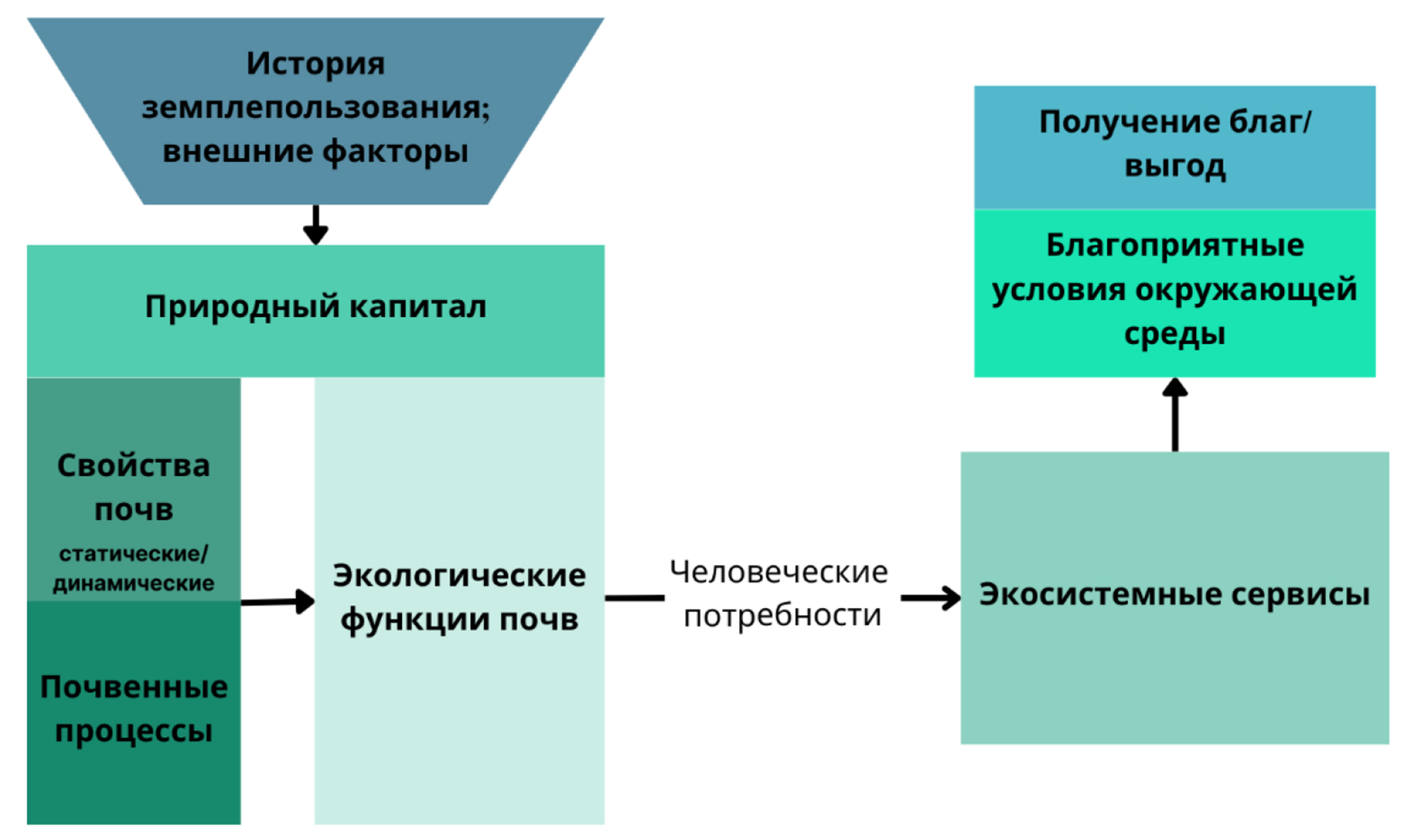 При рассмотрении функций почв в экосистемах и биосфере, авторы [4] трактовали их как роль и значение почв и почвенных процессов в жизнедеятельности указанных объектов, их поддержании и эволюции. Реализацию экологических функций почв определяют почвенные свойства и характеристики, их оптимальные значения позволяют почвам наиболее эффективно выполнять свои функции. В работе [49] представлен обширный литературный обзор почвенных сервисов и концепция их интеграции с почвенными функциями и свойствами почв. Отмечается сложная взаимосвязь как почвенных функций и процессов между собой, так и конкретного почвенного свойства с сервисами. Например, сложно определить вклад и дать однозначную оценку такому свойству как объемная плотность почв для реализации круговорота воды или для плодородия. Автором [49] разработана концепция, связывающая запасы природного (в том числе почвенного) “капитала”, который определяется статическими (уклон, экспозиция, подстилающие породы, каменистость) и динамическими характеристиками (pH, содержание углерода, температура почвы, растительность и характер наземного покрова), с реализацией экосистемных сервисов, которые направлены на обеспечение потребностей человека. Интеграция концепций экосистемных сервисов и экологических функций также рассмотрена в работе [22], где описана взаимосвязь почвенных свойств и их сервисов через почвенные функции. Согласно [91] свойства почвы, как сложной системы, могут быть сгруппированы в разных вариантах для одновременной оценки разных сервисов на различных уровнях.