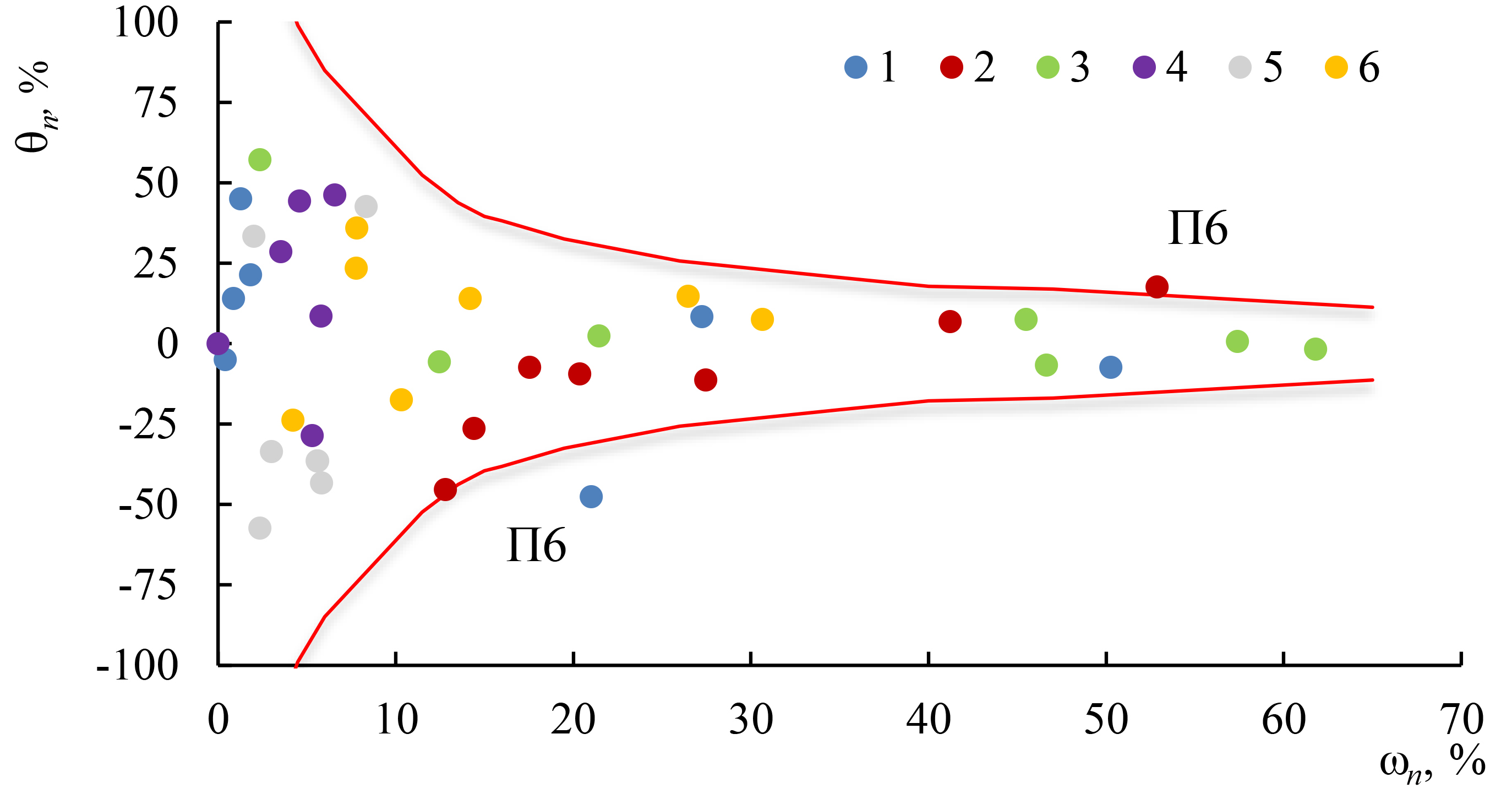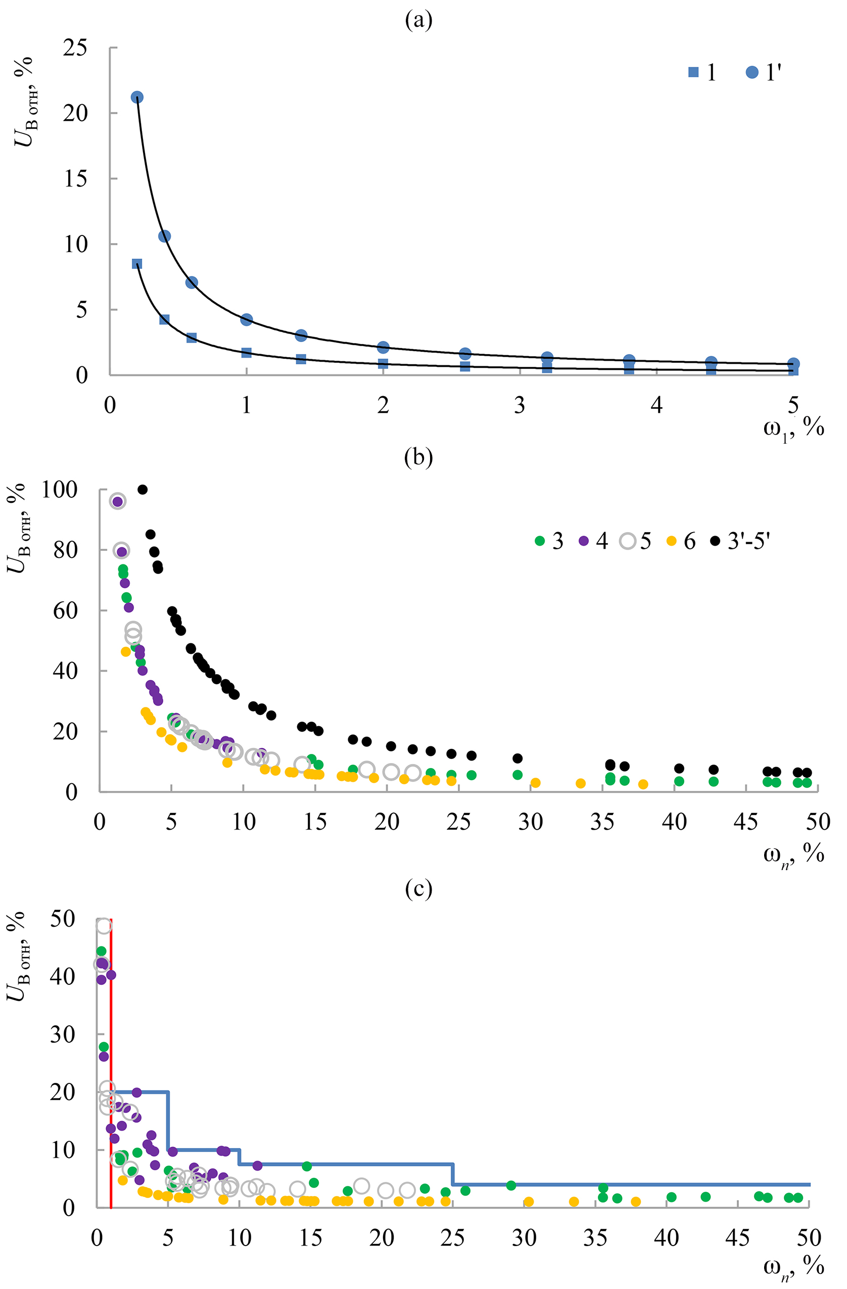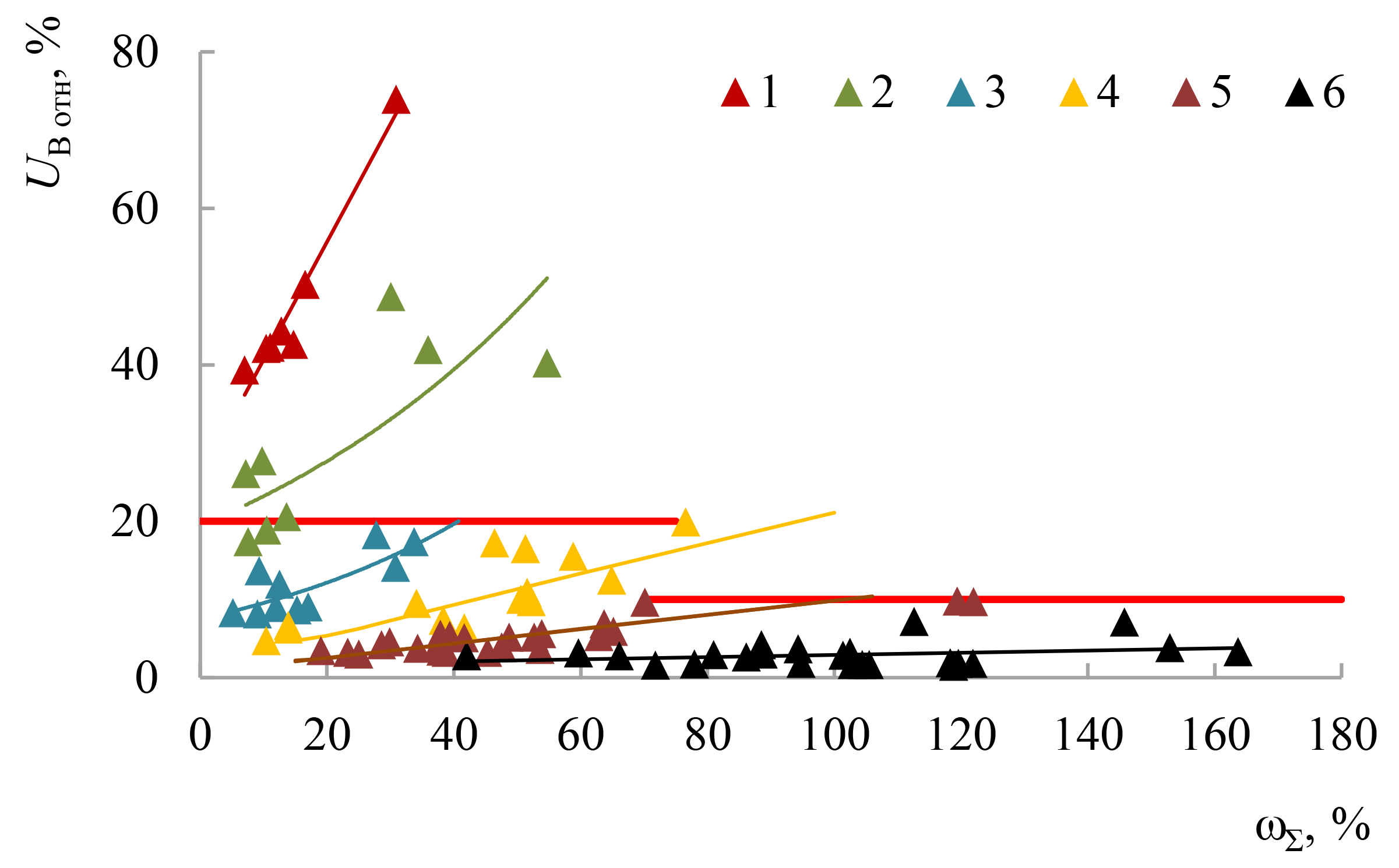 Рис. 7. Влияние суммы уменьшаемого и вычитаемого в формуле (3) (Σ(ωn)) на относительную неопределенность (UВ отн) массовой доли ЭЧП любой из шести фракций, обусловленную средствами измерений (mп = 25 г, весы первого класса точности): 1 – 0.3–0.5%, 2 – 0.5–1%, 3 – 1.0–2.0%, 4 – 2.0–5.0%, 5 – 5.0–10%, 6 – >10%. Красные линии – установленные значения UВ отн.
